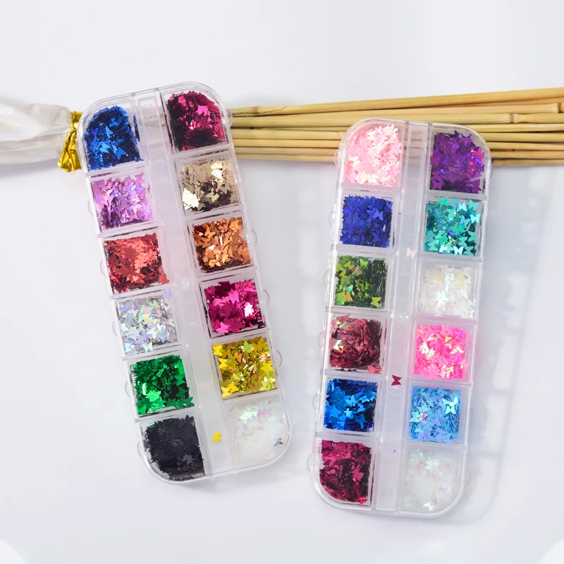 Блестящие пайетки для ногтей в виде бабочки, 12 ячеекнабор, разноцв...