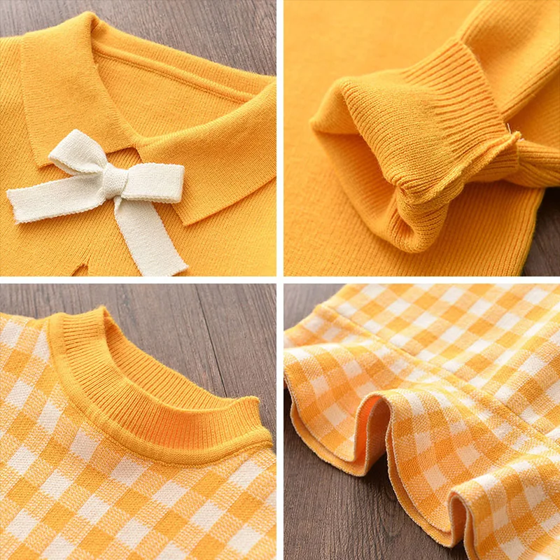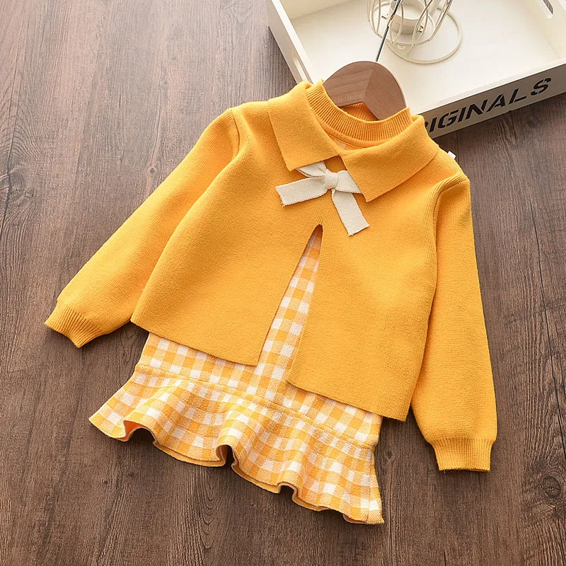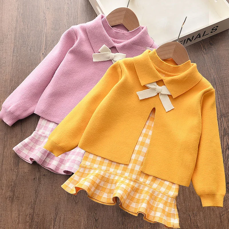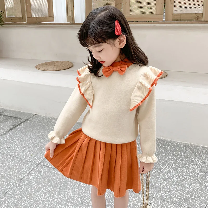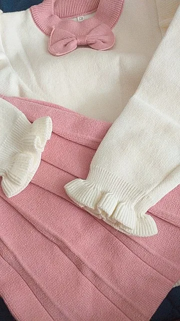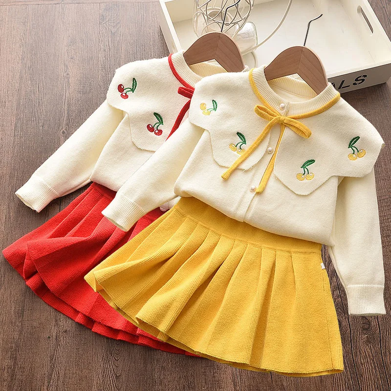 Одежда для маленьких девочек, Зимний вязаный свитер из двух предметов вишневая бабочка, милый свитер, детское платье-свитер, теплый свитер для маленьких девочек, костюм с юбкой