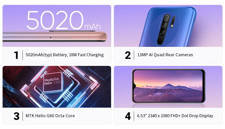 Смартфон Redmi 9, 6 ГБ ОЗУ, 128 Гб ПЗУ, Восьмиядерный, 13 МП, 4 камеры с искусственным интеллектом, аккумулятор 5020 мАч, 6,53 дюйма, точка-капля, дисплей, версия CN