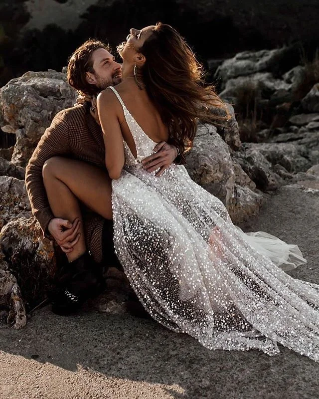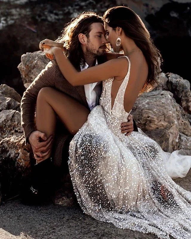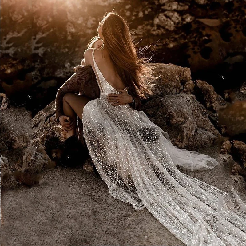 Пикантное пляжное свадебное платье Verngo с открытой спиной, блестящие свадебные платья с V-образным вырезом и блестками, скромное платье с разрезом спереди, 2020