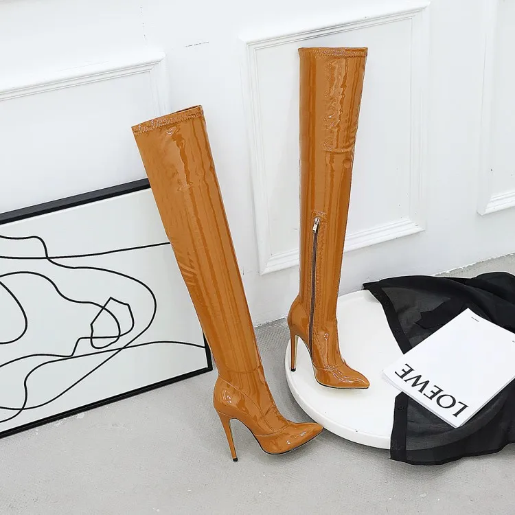Очень большие размеры 47, 48, 49; Женские носки на очень тонком высоком каблуке; Женские эластичные ботфорты из лакированной искусственной кожи