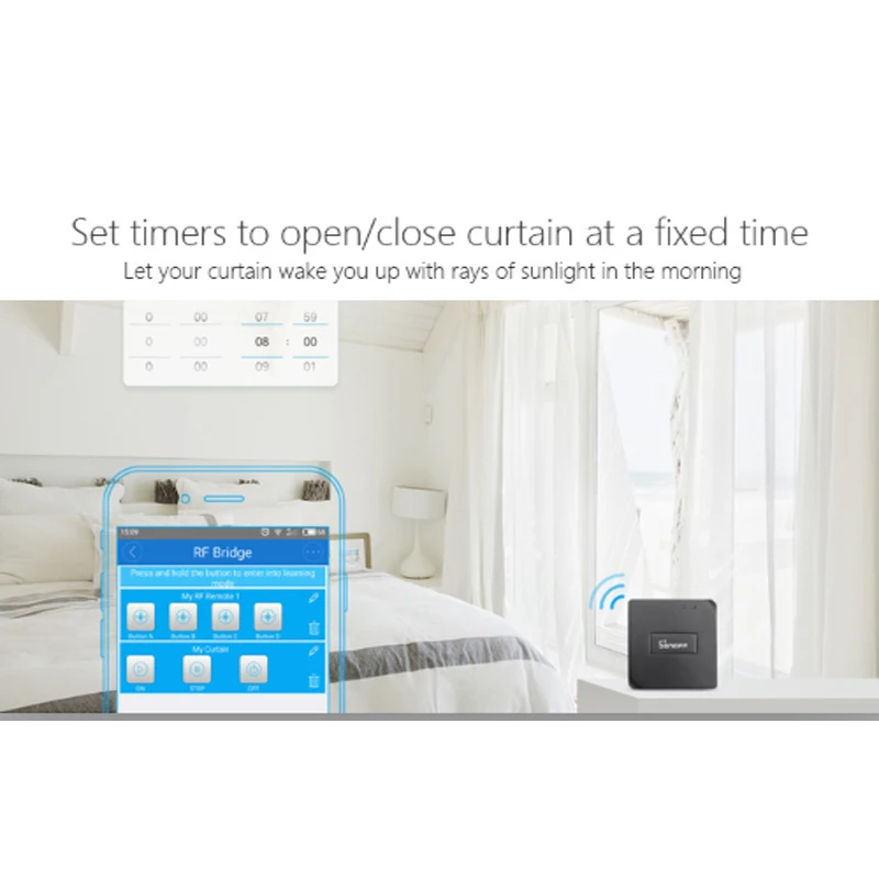 Широкий диапазон управления: для управления радиочастотными устройствами 433 МГц с радиочастотным пультом 433 МГц, вы должны оставаться в помещении. Радиочастотный мост Sonoff помогает переключать сигнал, позволяя управлять радиочастотными устройствами 433 МГц из любого места в любое время