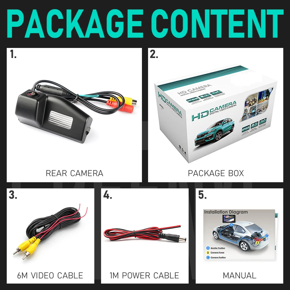 1. Задняя камера2 посылка3. Видеокабель (6 м)4. Кабель питания5. Руководство