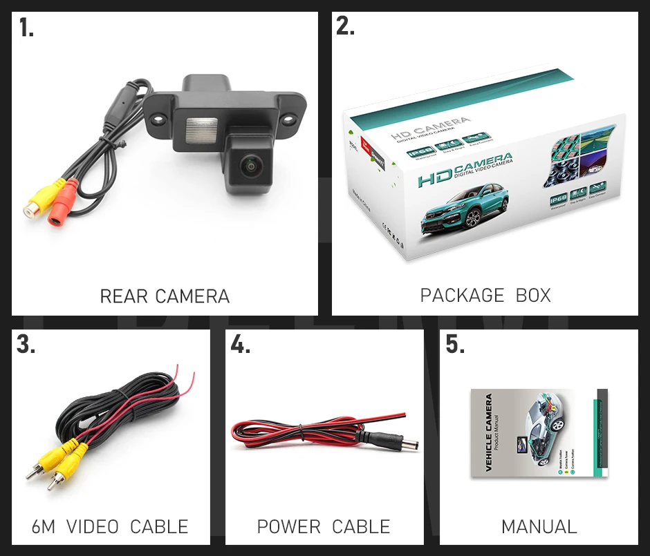 1. Задняя камера2. Коробка для посылка3. Видео кабель (6 м)4. Кабель питания5. Руководство пользователя