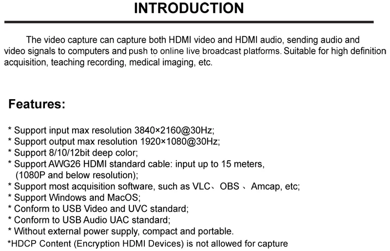 Эта карта сбора USB 2,0 может одновременно записывать как HDMI видео, так и HDMI аудио.Он может передавать аудио и видео сигналы на компьютеры и смартфоны для предварительного просмотра и хранения.Подходит для получения HD, обучения записи, медицинского изображения и т. Д.Характеристика:1. Поддержка максимального входного разрешения 3840x2160 @ 30 Гц;2. Поддерживает максимальное выходное разрешение 1920x1080 @ 30 Гц;3. Поддержка 8/10/12 бит глубины цвета;4. Когда используется стандартный кабель AWG26, Расстояние входной передачи составляет до 15 м (разрешение 1080P и ниже);5. Поддержка большинства программ для приобретения, таких как VLC, OBS, Amcap и т. д.;6. Поддержка windows, Android и Mac OS;7. Соответствует спецификации USB video UVC;8. Соответствует спецификации USB аудио UAC;9. Без внешнего источника питания, маленький и портативный.Спецификация:Разрешение HDMI: до 3840x2160 @ 30 ГцФормат видеовхода: 8/10/12 бит глубина цветаРежим видеовыхода: YUV, JPEGРазрешение видеовыхода: максимальное выходное разрешение 1920x1080 @ 30 ГцПоддержка аудио формата: L-PCMДлина входного кабеля: ≤ 15 м, стандартный кабель AWG26 HDMIМаксимальный рабочий ток: 0.4A/5VDCДиапазон рабочих температур: (от-10 до + 55 ℃)Размер: 64x28x1 3 мм/2.52x1.1x0.51inПодключение:1: подключите источник сигнала UHD и входной порт HDMI для USB карты сбора с помощью одной линии HDMI2: Подключите usb-разъем для USB карты сбора в usb-порт компьютера3: шаги по сборке (OBS): Откройте программное обеспечение-добавьте новый источник-выберите «устройство видеозахвата»-Установите размер экрана-выберите «режим студии» (двойное окно)-Нажмите «начать запись»Требования к конфигурации компьютерного оборудования:ЦП: ПК i5-3400 или выше; NB i7-3537u 2,0 ГГц или вышеКарта дисплея: ПК NVIDIA GT630 или выше; NC NVIDIA GT735M или вышеПамять: 4G RAMПримечание:В связи с различиями мониторов и эффектами освещения реальный цвет товара может немного отличаться от цвета на фотографиях. Спасибо!Возможны отклонения в 1-3 мм вследствие измерений вручную.