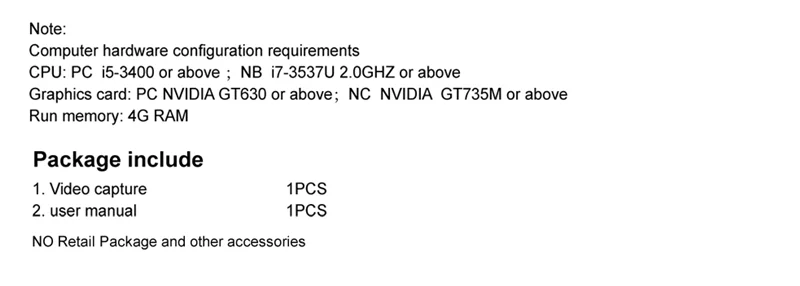 Эта карта сбора данных USB 2,0 может одновременно захватывать видео HDMI и аудио HDMI.Он может передавать аудио и видео сигналы на компьютеры и смартфоны для предварительного просмотра и хранения.Подходит для записи HD, обучения записи, медицинского изображения и т. д.Особенность:1. Поддержка максимального входного разрешения 3840x2160 @ 30 Гц;2. Поддержка максимального выходного разрешения 1920x1080 @ 30 Гц;3. Поддержка глубины цвета 8/бит;4. При использовании стандартного кабеля AWG26 расстояние передачи на входе составляет до 15 м (разрешение 1080P и ниже);5. Поддержка большинства программ для приобретения, таких как VLC, OBS, Amcap и т. д.;6. Поддержка windows, Android и Mac OS;7. Соответствует спецификации USB video UVC;8. Соответствует спецификации USB audio UAC;9. Без внешнего источника питания, маленький и портативный.Спецификация:Разрешение HDMI: до 3840x2160 @ 30 ГцФормат видеовхода: Глубина цвета 8/битРежим вывода видео: YUV, JPEGРазрешение видеовыхода: максимальное выходное разрешение 1920x1080 @ 30 ГцПоддержка аудиоформата: L-PCMДлина входного кабеля: ≤ 15 м, стандартный кабель AWG26 HDMIМаксимальный рабочий ток: 0,4 А/5 В постоянного токаДиапазон рабочих температур: (от-10 до + 55 ℃)Размер: 64x28x13 мм/2,52x1,1x0,51 дюймаПодключение:1: подключите источник сигнала UHD и входной порт HDMI карты сбора USB с помощью одной линии HDMI2: Подключите USB-штекер карты сбора USB к USB-порту компьютера3: шаги сбора (OBS): Откройте программное обеспечение-добавьте новый источник-выберите «устройство видеозахвата»-Установите размер экрана-выберите «студийный режим» (двойное окно)-Нажмите «начать запись»Требования к конфигурации компьютерного оборудования:ЦП: ПК i5-3400 или выше; NB i7-3537u 2,0 ГГц или вышеКарта дисплея: ПК NVIDIA GT630 или выше; NC NVIDIA GT735M или вышеПамять: 4G RAMПримечание:В связи с различиями мониторов и эффектами освещения реальный цвет товара может немного отличаться от цвета на фотографиях. Спасибо!Возможны отклонения в 1-3 мм из-за измерений вручную.