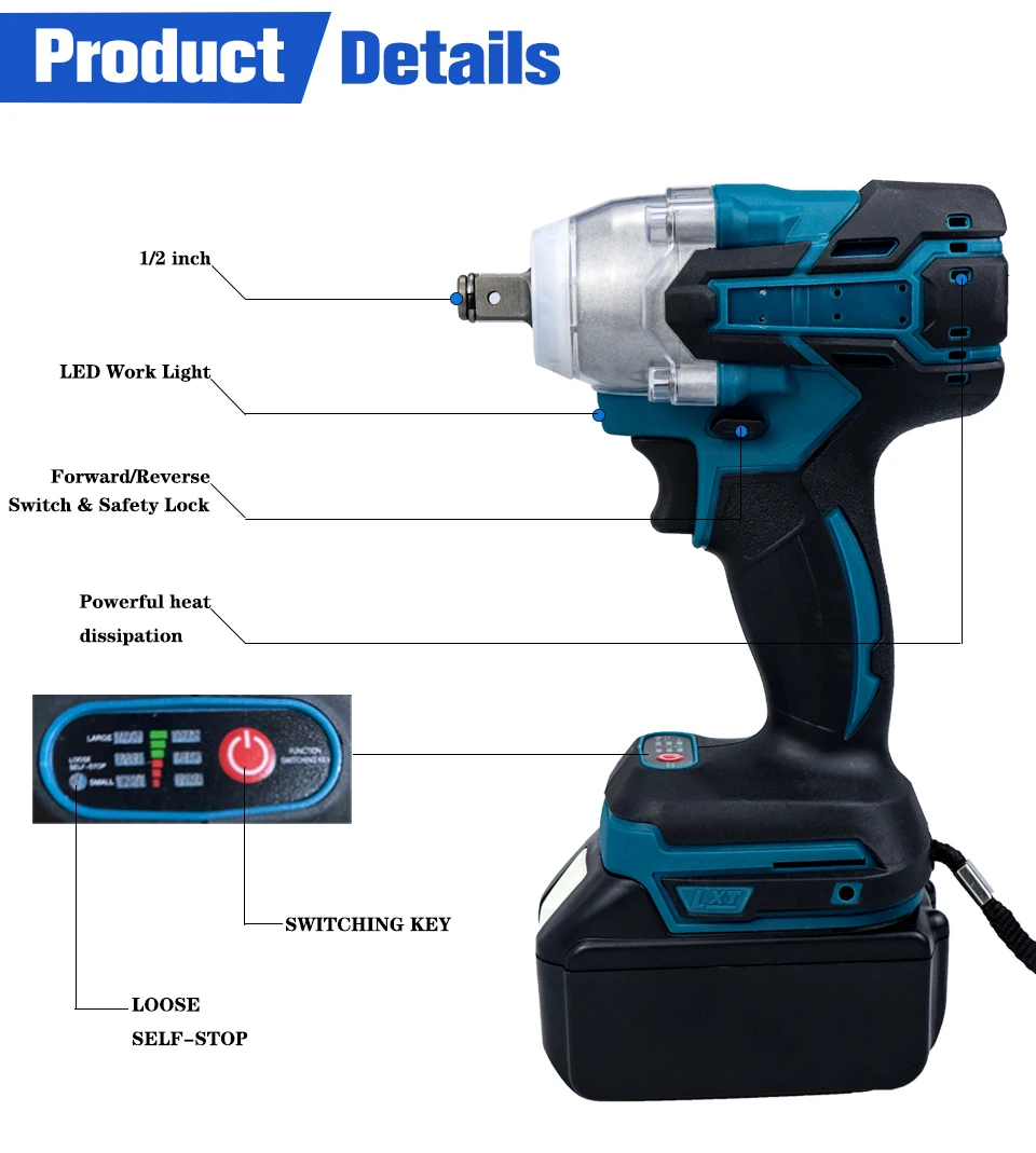 Квадратный привод: 1/2"Особенности-Высокий крутящий момент 320 нм, бесступенчатый переключатель переключения скорости.
