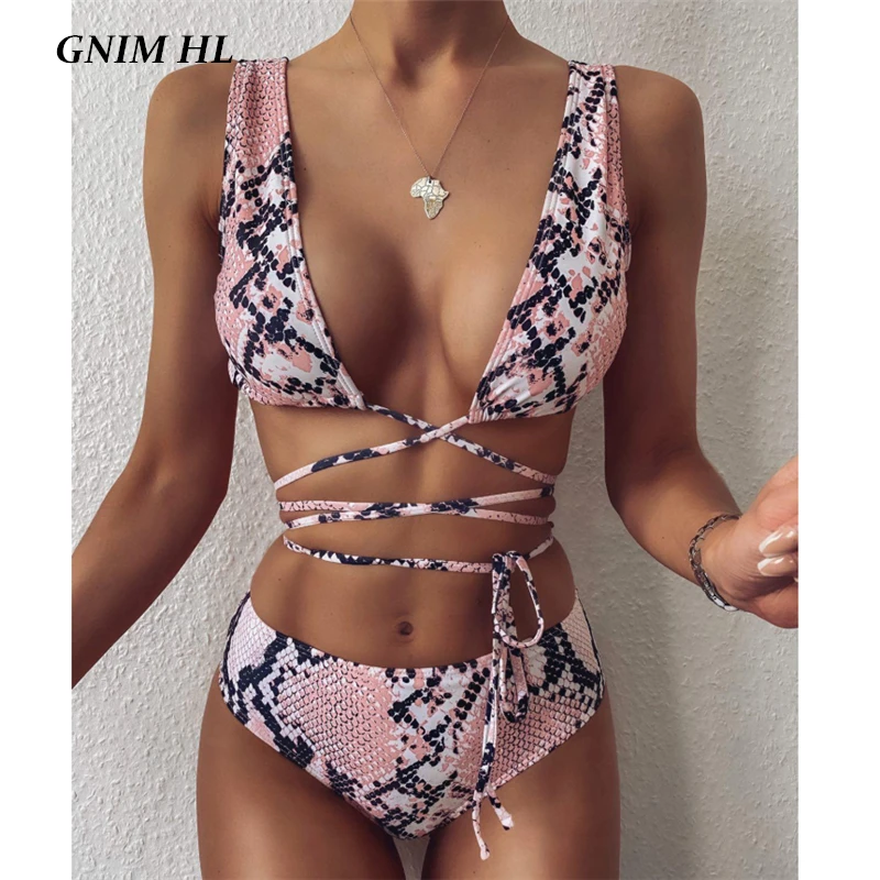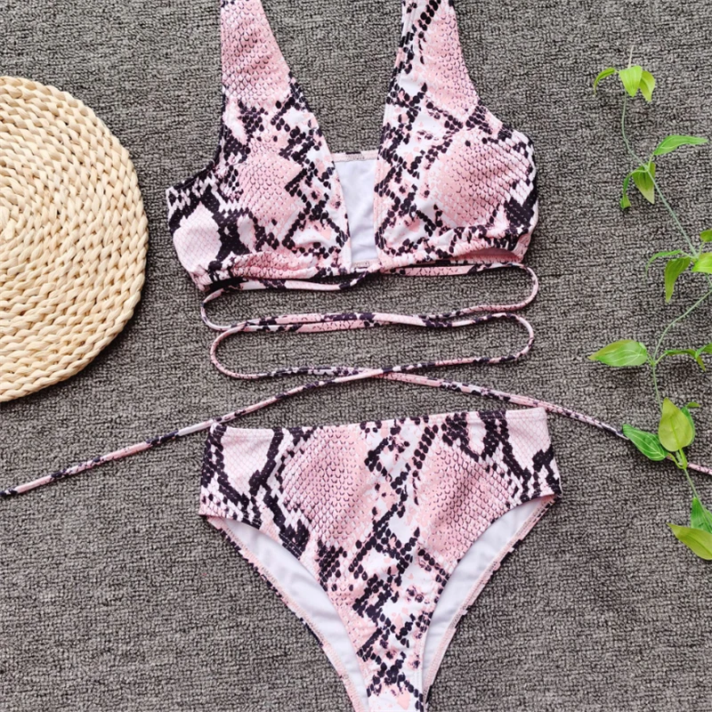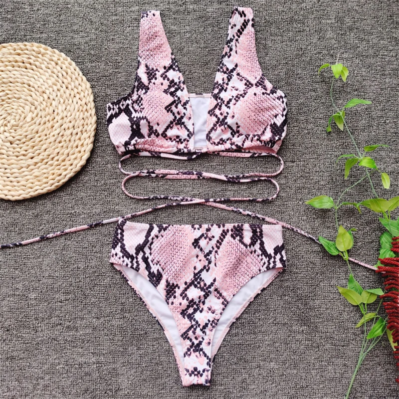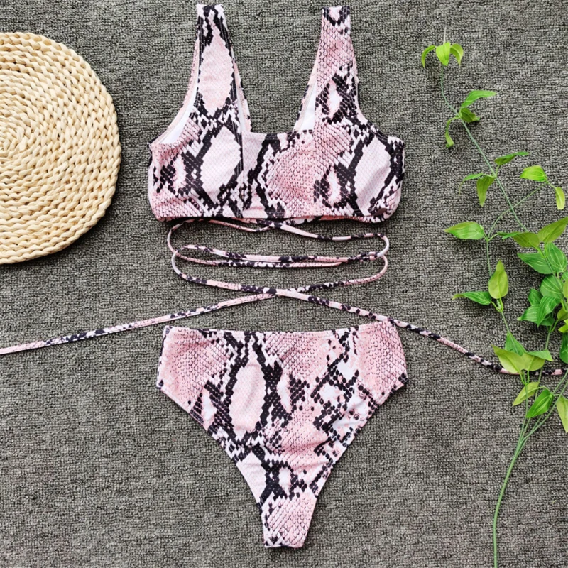 Бикини женское Бандажное со змеиным принтом и высокой талией