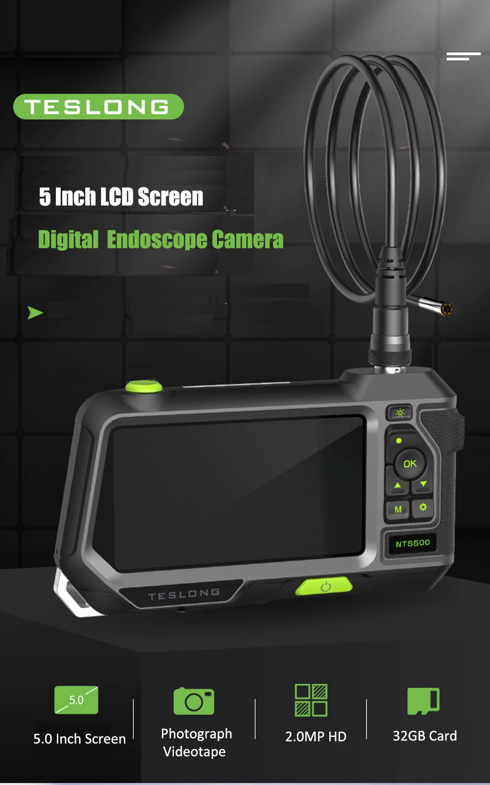 Эндоскоп Teslong NTS500 с тройным объективом 8 мм и ЖК-дисплеем 5,0 дюйма, камера IP67 1080P HD для осмотра автомобильных труб, 6 светодиодов, 32 ГБ, TF карта