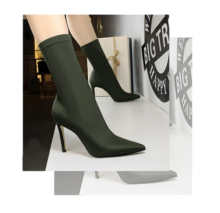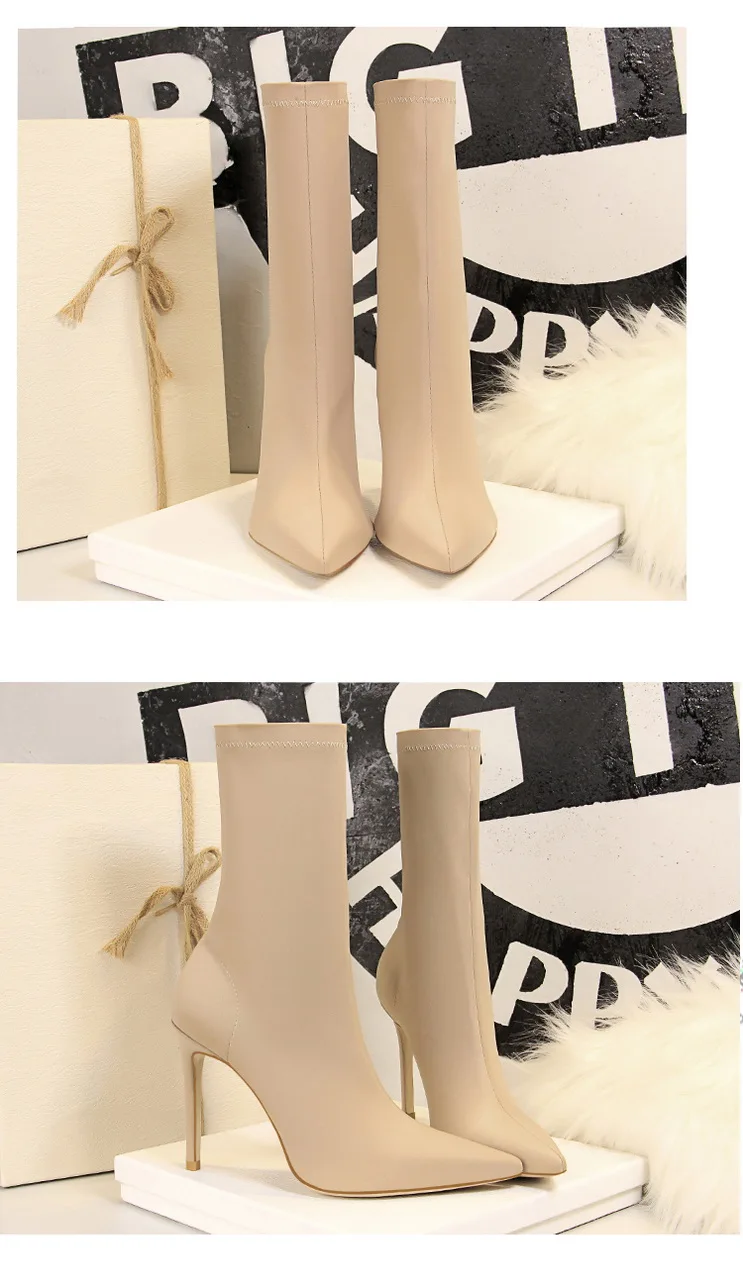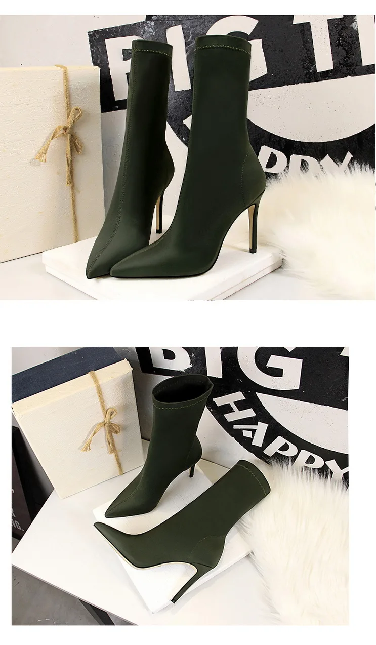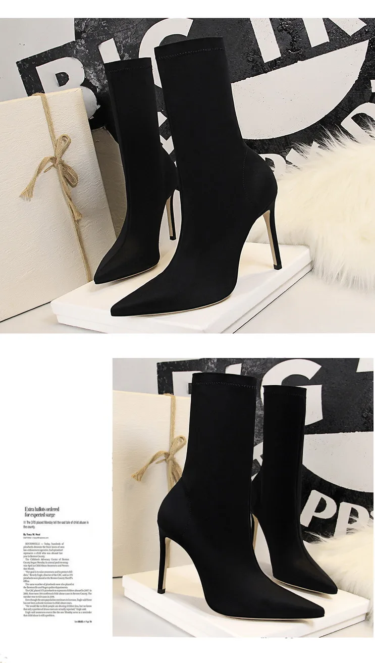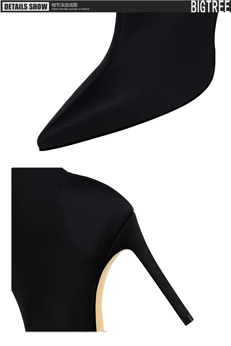 Женские ботинки из эластичной ткани BIGTREE, Лоскутные ботинки до середины икры на тонком каблуке, повседневная обувь с острым носком, весна 2022