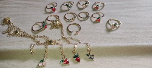 Кольца женские золотые с кристаллами, яблоко, клубника, вишня, виноград, 11 шт.компл.