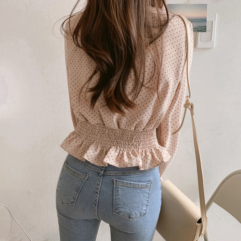Винтажная женская блузка в горошек с V-образным вырезом и расклешенными рукавами, элегантные рубашки с пуговицами спереди, приталенная женская блузка с оборками, блузы 2020