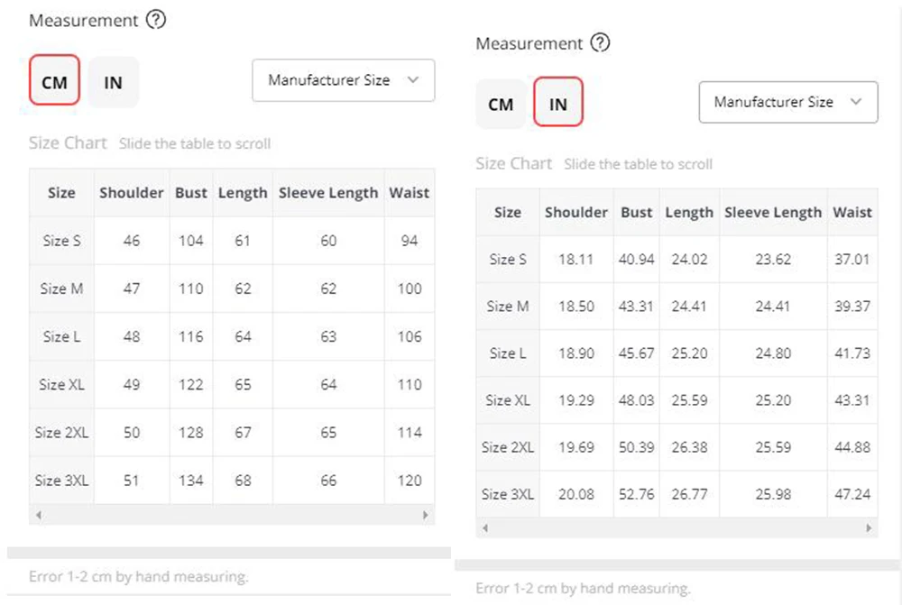 Все вышеуказанные измерения являются фактическими измерениями одежды. Для хорошей посадки, пожалуйстаДобавьте 16 см ~ 20 см в грудьПри выборе размера из приведенной выше таблицы. Перед выбором размера убедитесь, что вы правильно измерили свой размер, чтобы избежать ошибок.