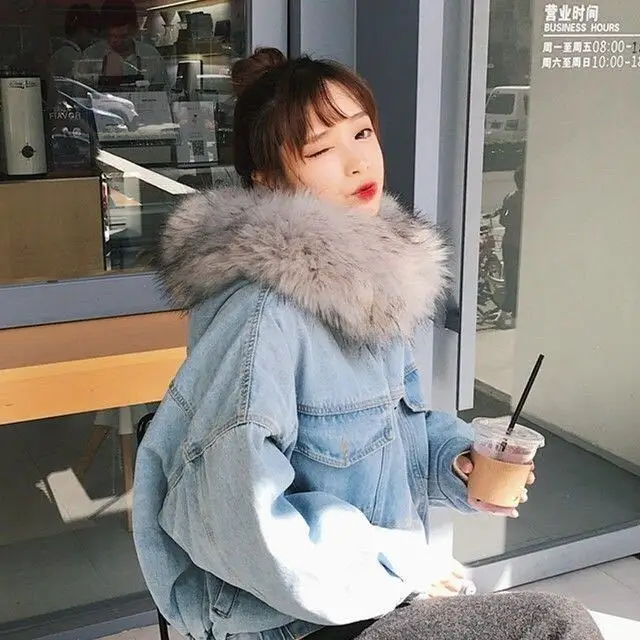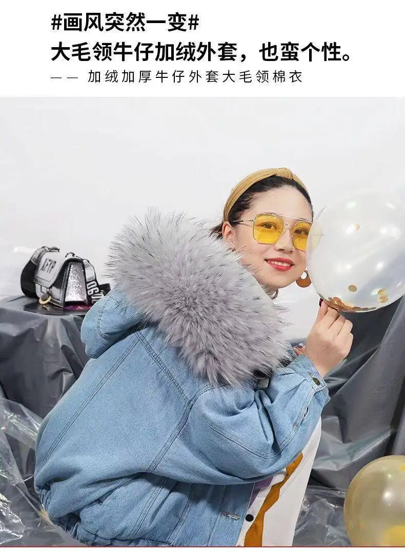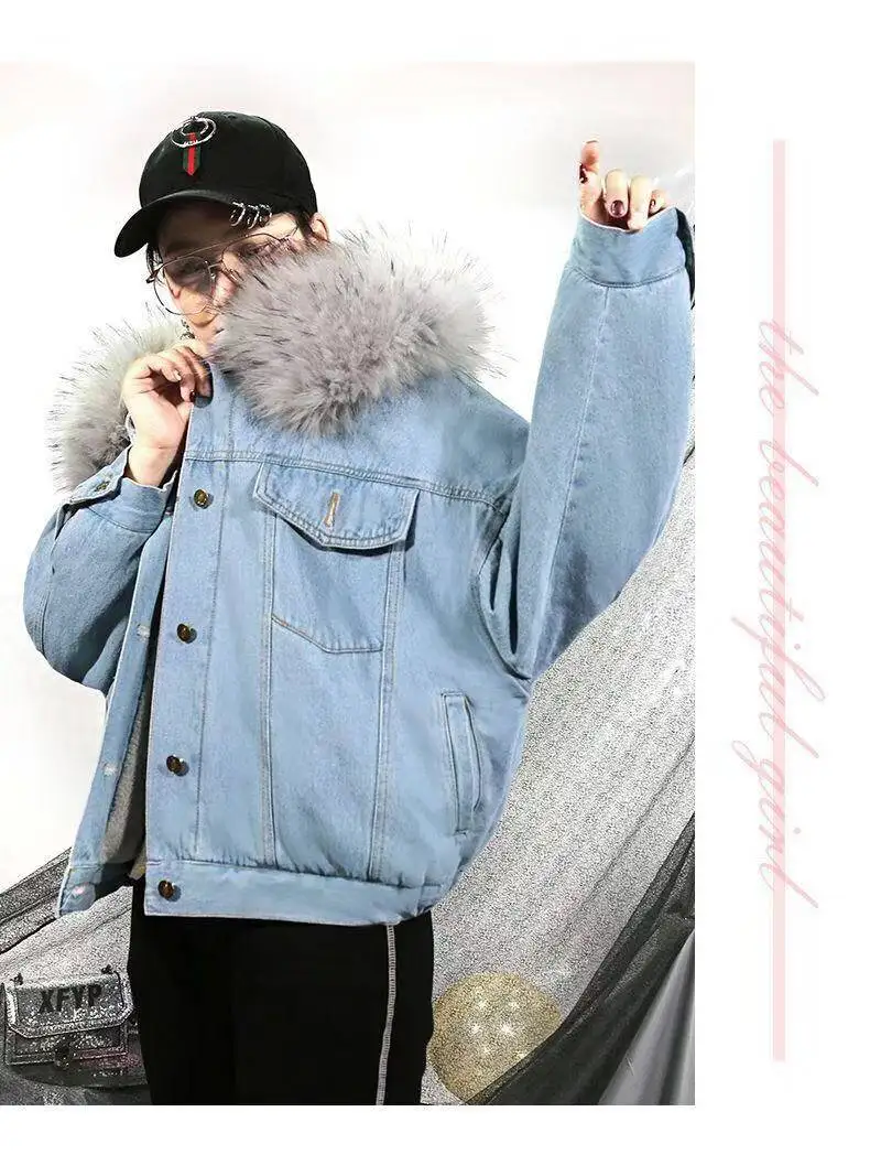 Женская джинсовая куртка, свободная утепленная куртка с большим мех...