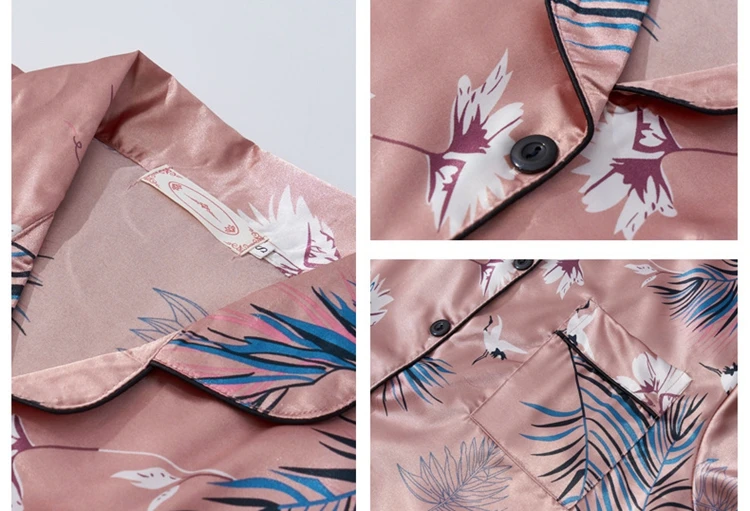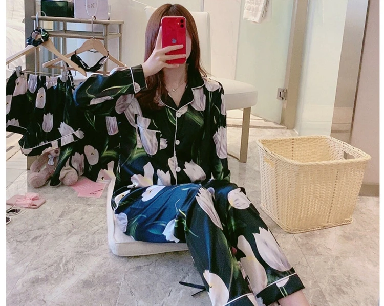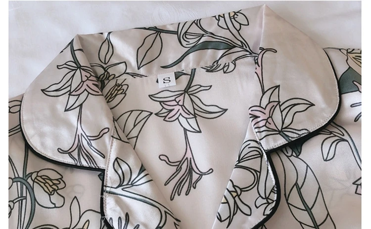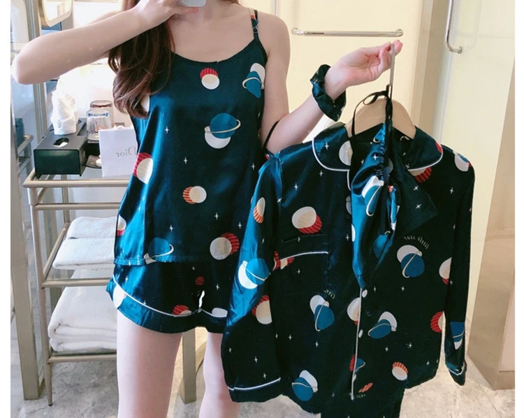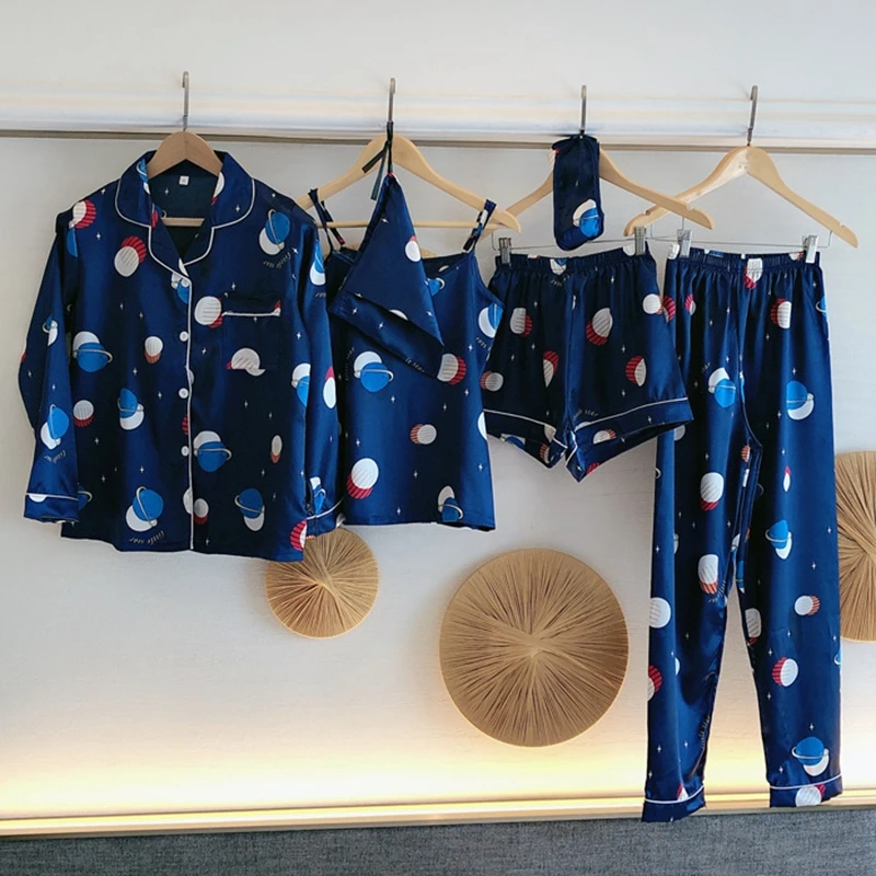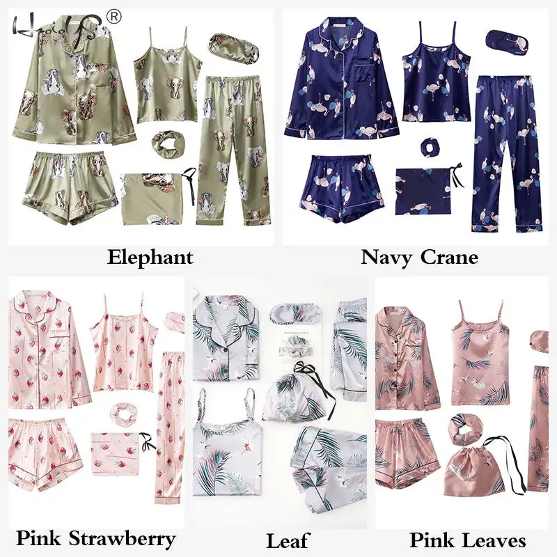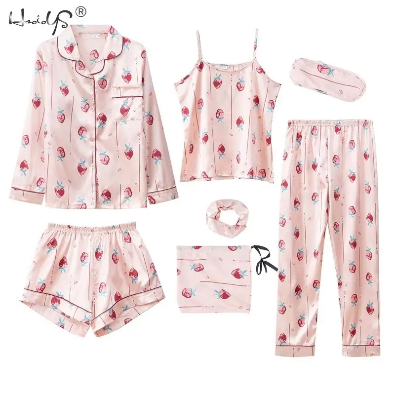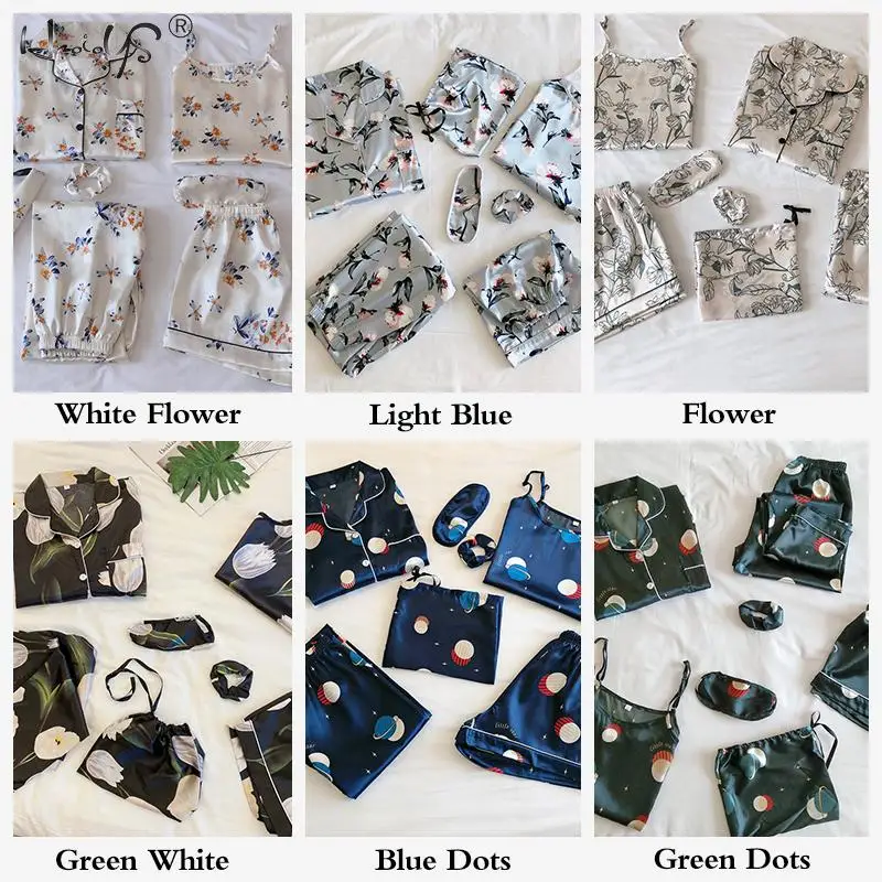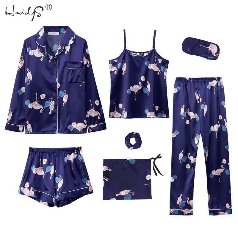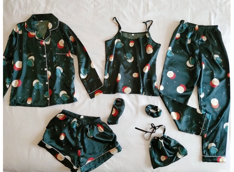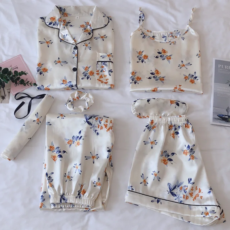 Комплект пижамный женский из 7 предметов, комплект с принтом и длинными рукавами, шорты на бретелях, ночная рубашка из искусственного шелка, домашняя одежда, весна-лето