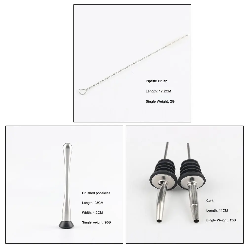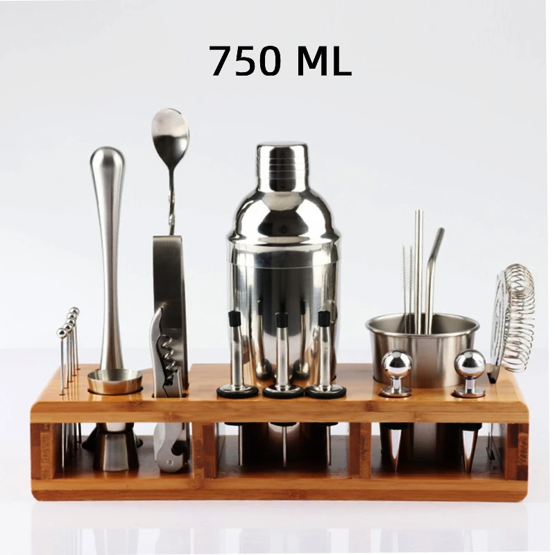 Особенности:1. Набор включает 23 шт., необходимых для смешивания напитков, поставляется с деревянной подставкой с прорезями для удобного хранения.2. Каждый элемент изготовлен из гладкой и прочной нержавеющей стали, поэтому он не будет иметь никаких проблем с сохранением запахов или окрашивания и прослужит долго.3. Роскошный Серебристый цвет и простой дизайн подходят для любого бара или для личного использования.4. Гладкие линии и мягкие изгибы, удобно держать и использовать.5. Идеально подходит для приготовления коктейлей и причудливых напитков.