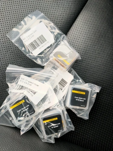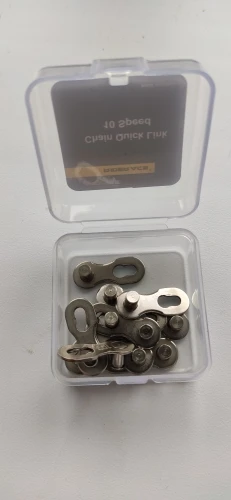 Доставлено в Тверь за 11 дней в пятерочку, упаковано в пакет с пупыркой. Сами замки в кейсе. Толщина 0.9мм, kmc x10 имеет точно такую же толщину звеньев. Сами звенья в смазке для транспортировки, липкие, замок от руки не застёгивается, товар отличный, металл скорее всего сталь, магнитится. Можно смело брать. С продавцом не общался, отправлено быстро.