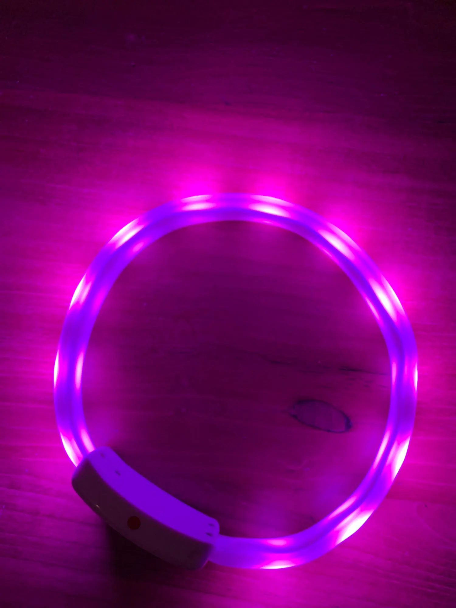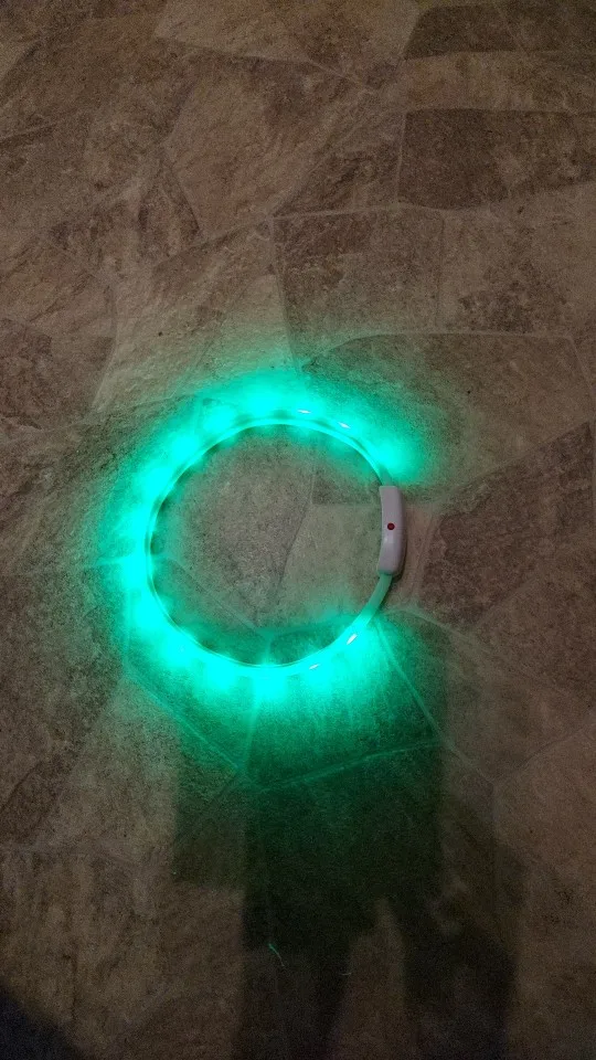 Супер ощейник. Яркий очень-очень, но если тухнет, то сразу. Хватает 1-1.5 прогулки (и тухнет сразу). Не забывайте зарежать.