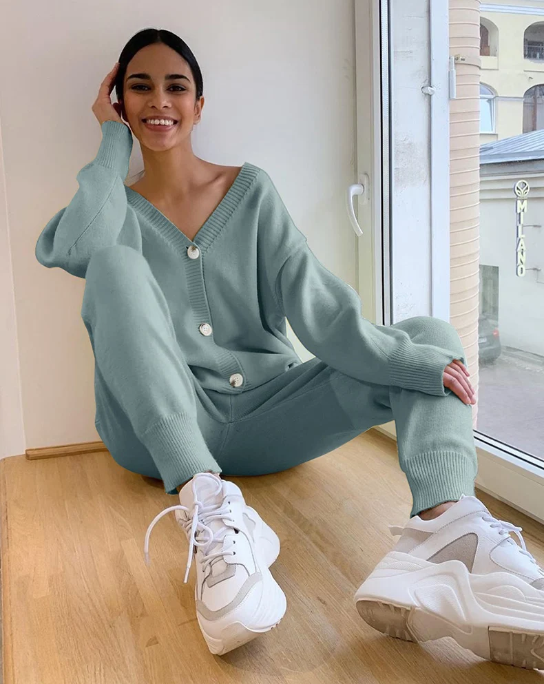 Женский трикотажный костюм, кардиган с V-образным вырезом и длинные штаны, Осень-зима, 2020