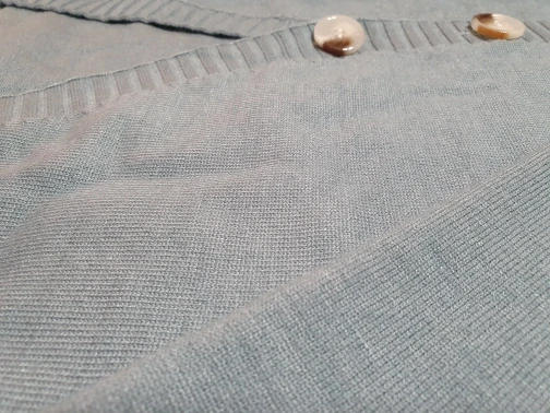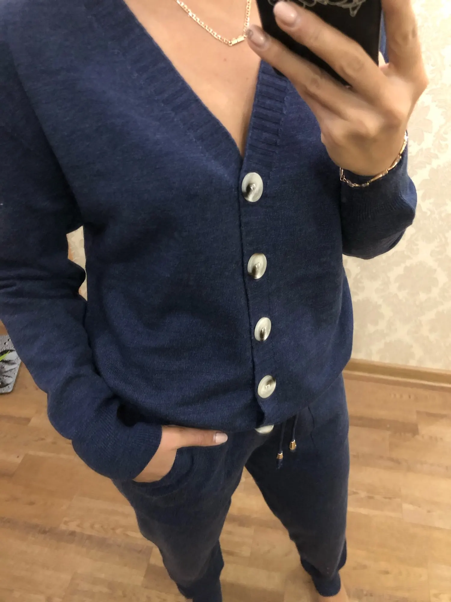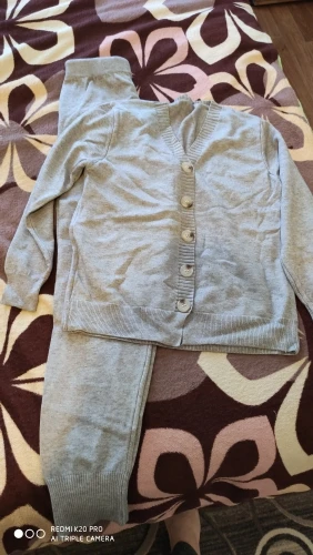 кардиган тоньше и немного светлее штанов, это основной минус. к штанам претензий нет.