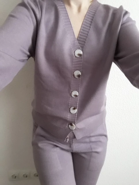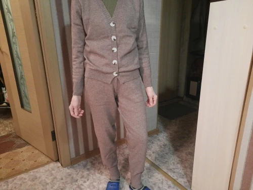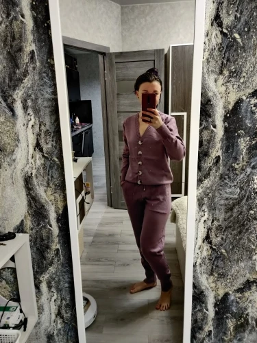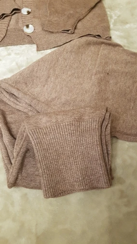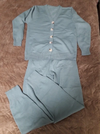 Приятная на ощупь ткань, тело ощущает себя свободно, нигде ничего не мешает. Торчат нитки (см. фото). Штаны сели хорошо, высокая талия, длина на рос 165 см идеально подходит. У кардигана короткий рукав. Мои параметры 83-67-100. В целом, костюмом довольна, но второй раз не стала бы заказывать.