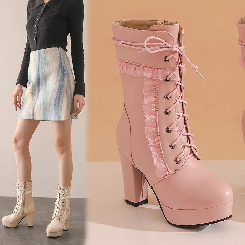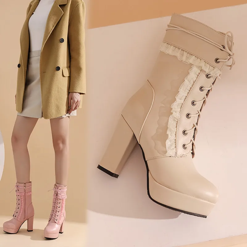YMECHICмодные зимние вечерние женские свадебные туфли на высоком каблуке; Цвет белый, розовый, черный; Байкерские ботильоны на платформе со шнуровкой и оборками; Большие размеры