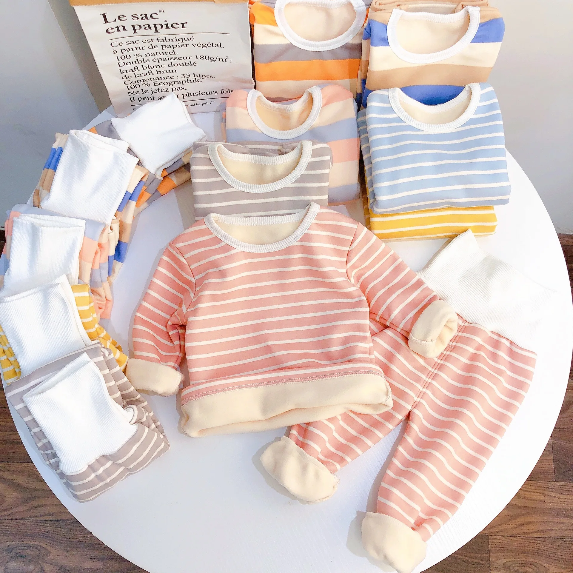Осень-зима 2022 г., новые комплекты детской одежды, теплая полосатая футболка и брюки, 2 шт.компл., От 2 до 6 лет, домашняя одежда для мальчиков и девочек, детская одежда