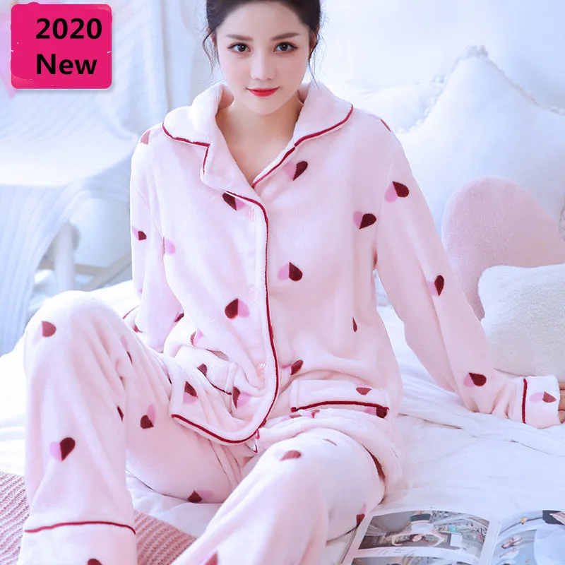 Winter Women's Pajamas Set Sexy Print Flower Pajamas 2020 Fashion Mom Casual Female Turn-down Collar Flannel Sleepwear