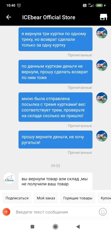ужасный продавец!!! вернула на заказу три куртки, но деньги вернули только за одну! продавец врет что получил только одну. нечестный продавец! отказывается проверят на складе полученный товар. посылка весит 3.4 кг, это явно три куртки
