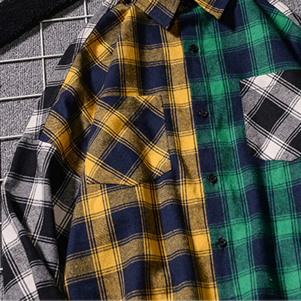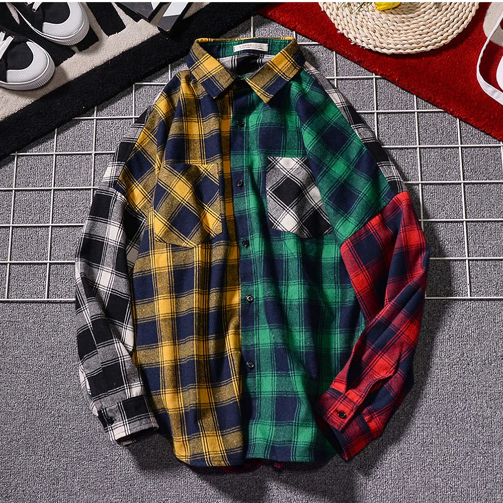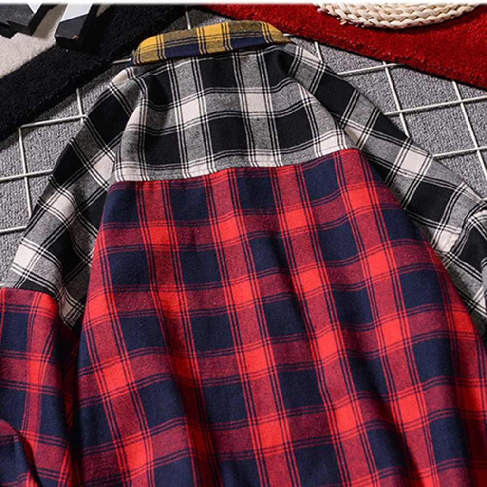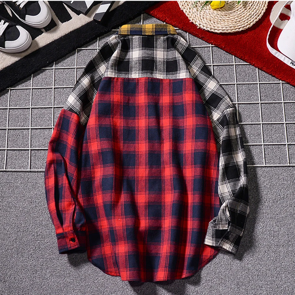 Удобная рубашка с длинным рукавом в японском стиле Харадзюку, винтажная клетчатая рубашка в стиле пэчворк, фланелевая рубашка в клетку на весну и осень, повседневная мужская рубашка MCL249