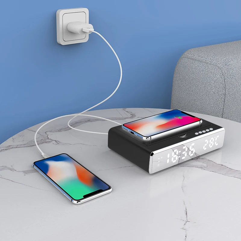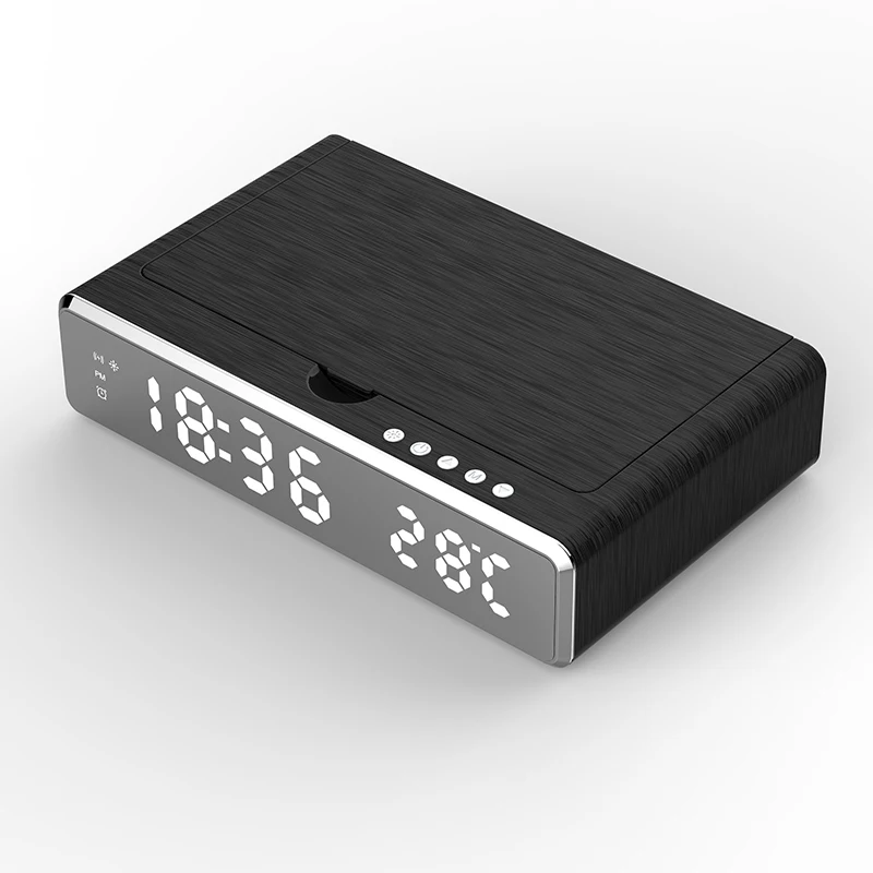 Функции: часы, будильник (3), термометр (можно переключать по Цельсию и по Фаренгейту), коробка для дезинфекции беспроводной зарядки