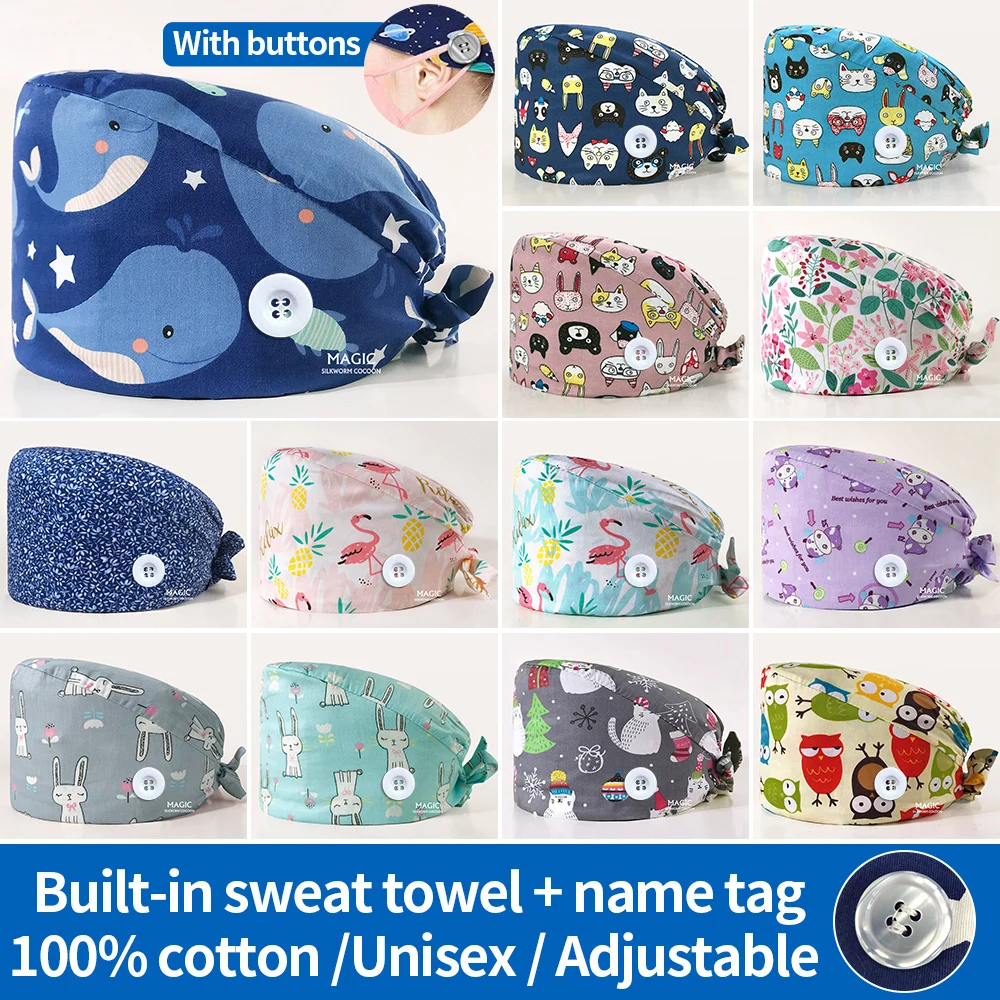 Шапка-скраб унисекс, хлопковая, регулируемая, с мультяшным принтом животных, матовая, для салона красоты, для работы и лаборатории