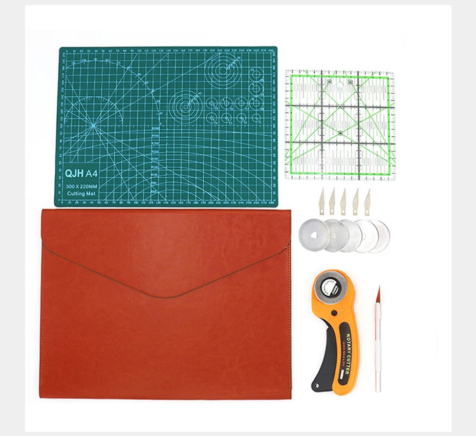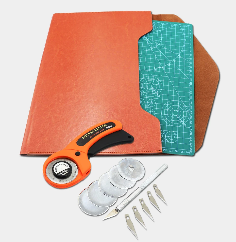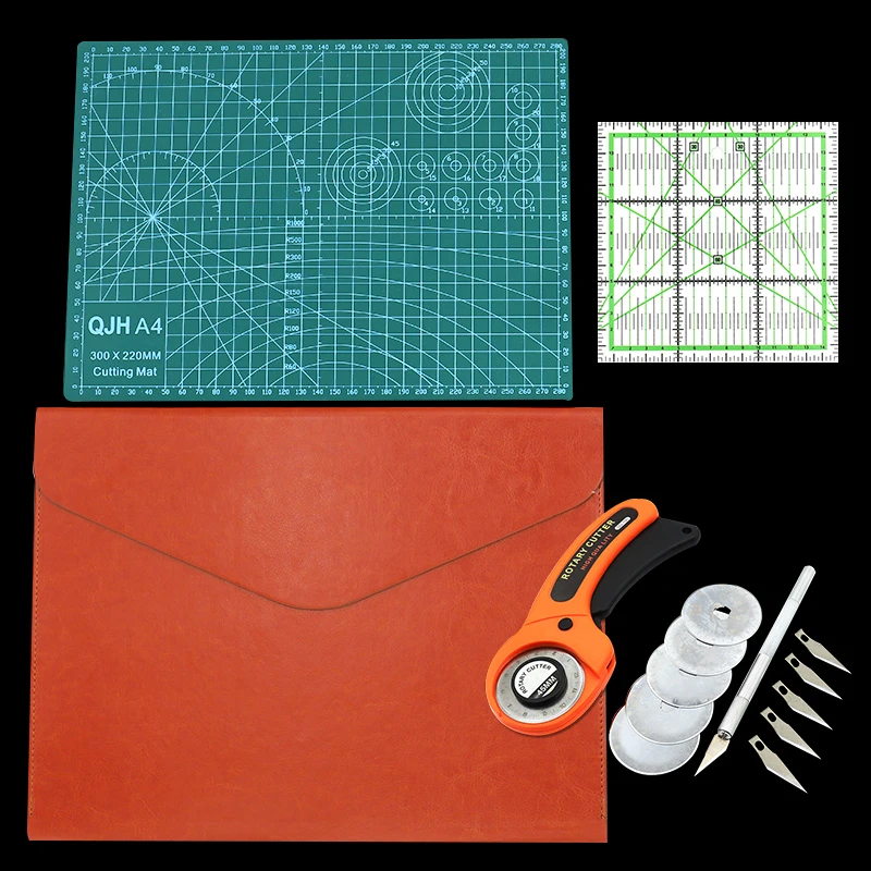 Этот набор удовлетворит все ваши потребности. Содержит 1 резак для оранжевой ткани 45 мм с 5 лезвиями, 1 режущую площадку A4, 1 шт. 15*15 см двухцветная квадратная линейка для пэчворка, 1 резак для резьбы с 5 лезвиями.