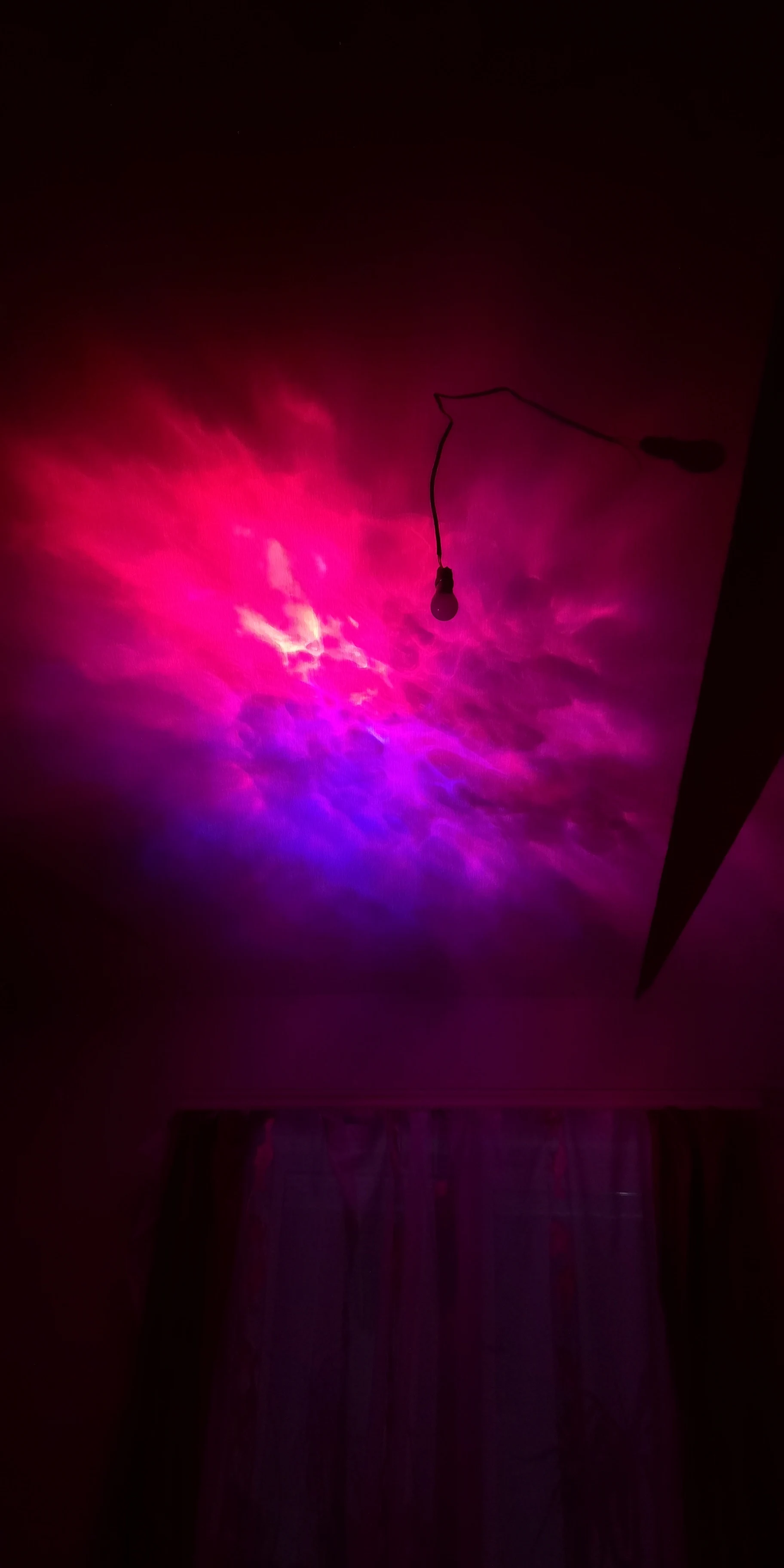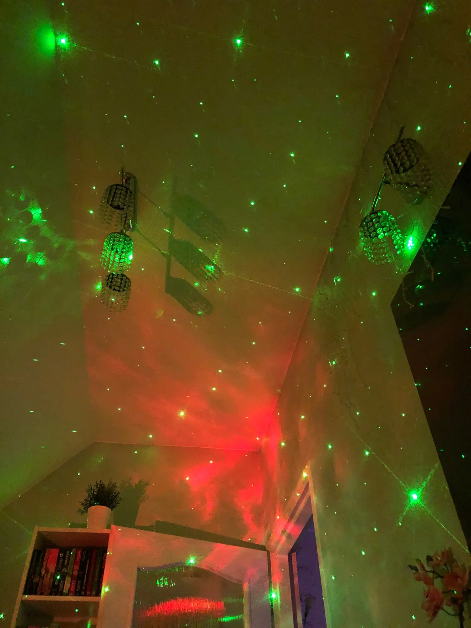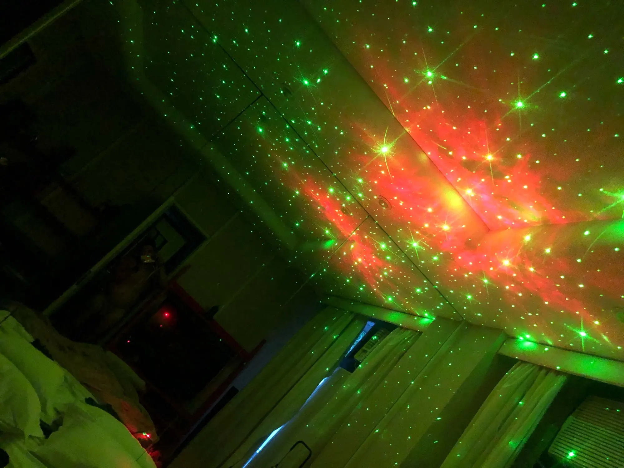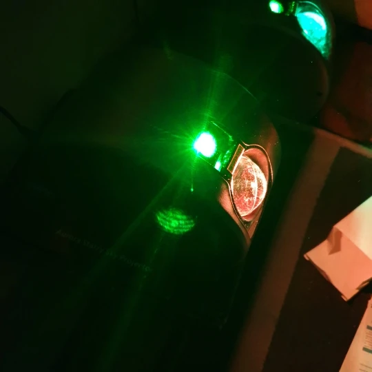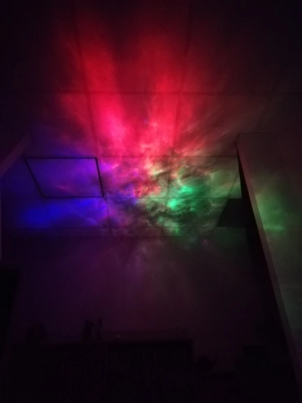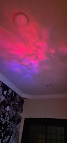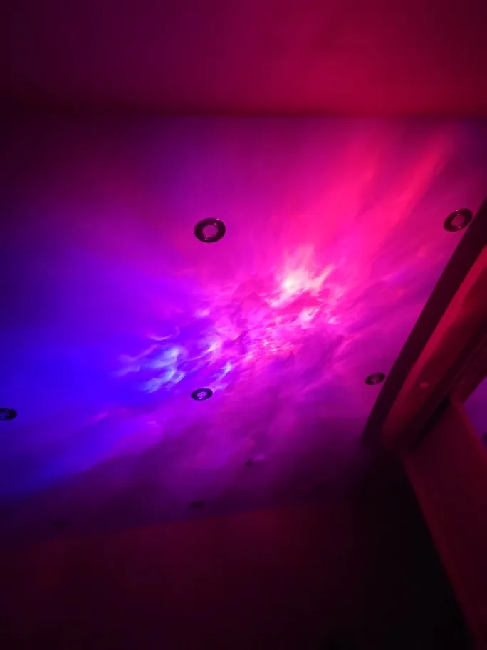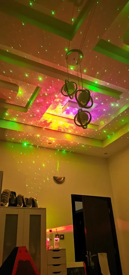 Красивая залипательная штука, кошка не даст соврать. Хорошо, если у вас есть зеркала в помещении и потолок сложной формы. С высоты 70см от пола дает на потолке изображение около 3м в диаметре. Зеленый светодиод сгорел сразу, остались только красный и синий. Лазер только зелёный, к сожалению, лучше бы белый или голубой поставили. Настраиваются 3 уровня подсветки, 3 скорости вращения лазера, можно включать RGB по отдельности.