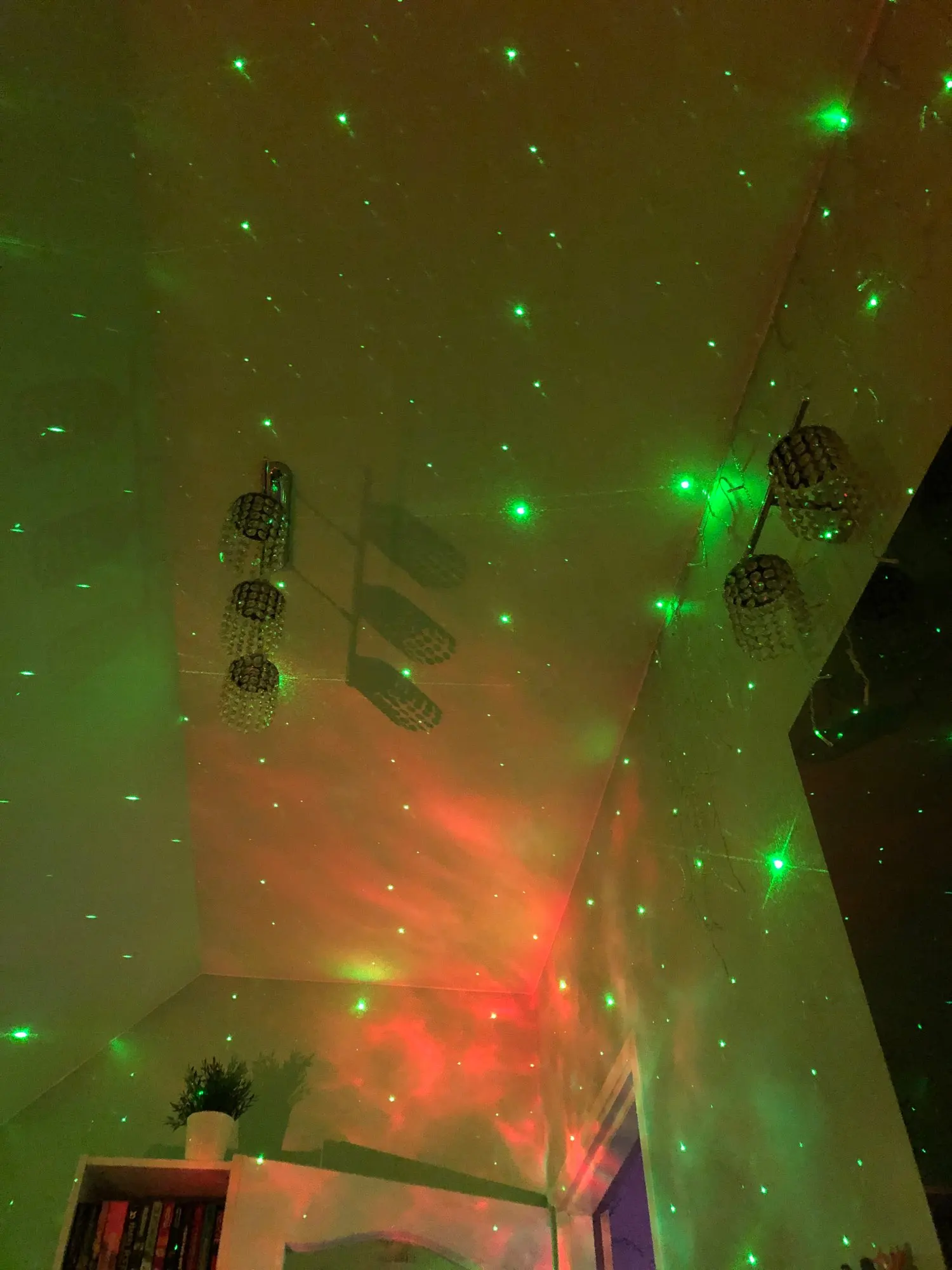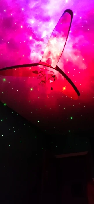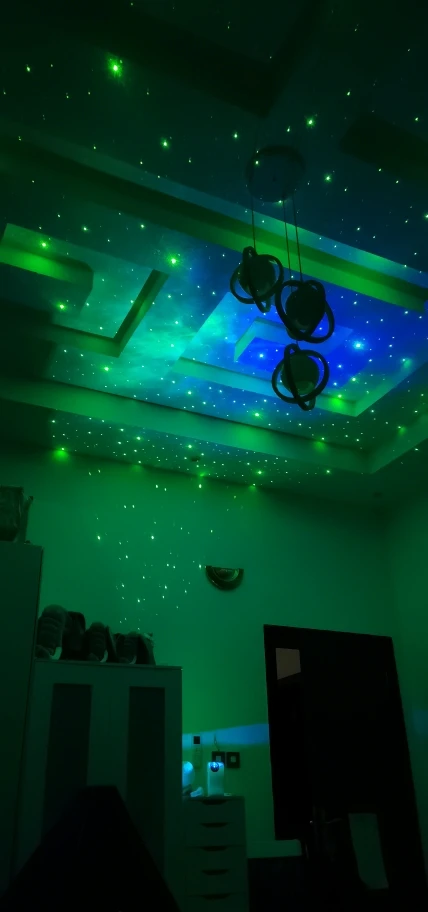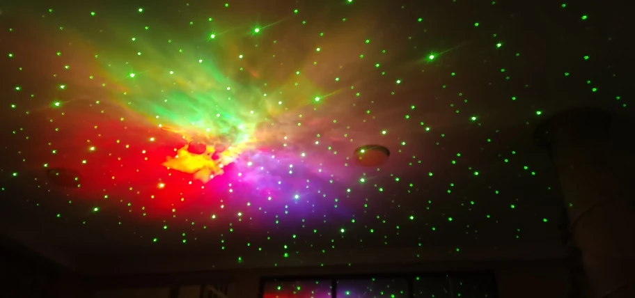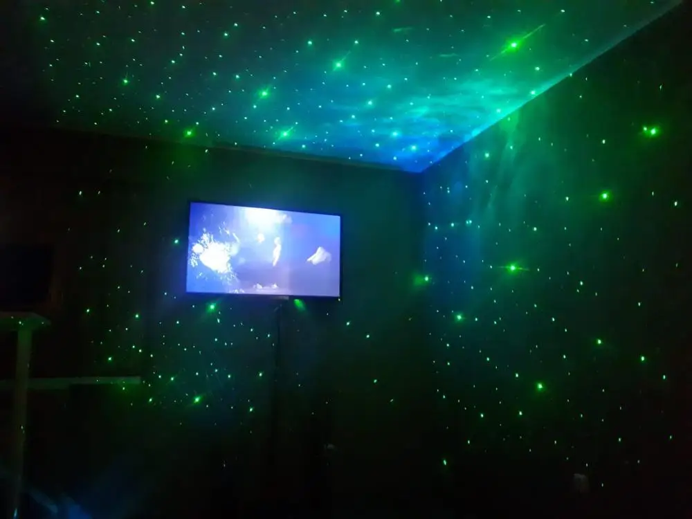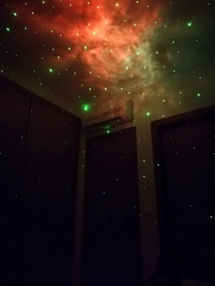 Вживую смотрится очень здорово. Прекрасно хватает на комнату 18-20 кв.м. Лазеры иногда отражаются от зеркальных или светлых поверхностей, так что возникает эффект падающих звезд. Имейте ввиду, что кабель в комплекте недлинный, так что розетка должна быть недалеко от ночника или удлинитель. Включается с пульта, от простой подачи электричества нет, поэтому на какой-нибудь датчик с таймером подсадить не получится. И самое главное, может это мой такой попался или особенность ночника, если работает больше 3-4 часов, начинает издавать какие-то похрустывания и скрип, довольно громкие. Так же работает совершенно бесшумно. Если дать отдохнуть с час-другой, звуки опять пропадают. Возможно, из-за нагрева и надо разобрать и смазать механизм. В любом случае покупкой очень доволен. Продавца рекомендую: дошло менее чем за 3 недели и все было упаковано очень хорошо. Пара друзей в гостях увидели ночник в работе и тоже планируют заказать у этого продавца.