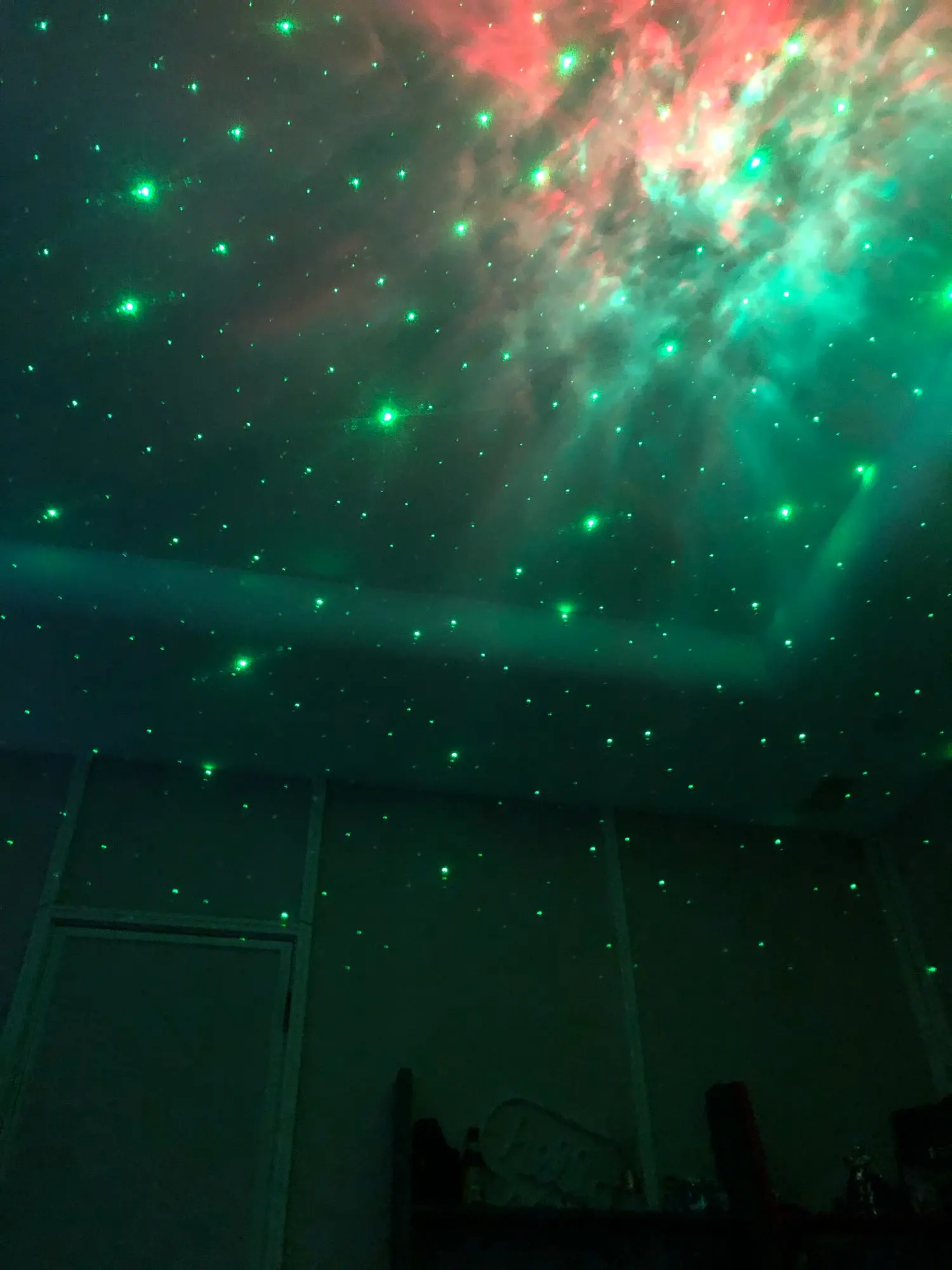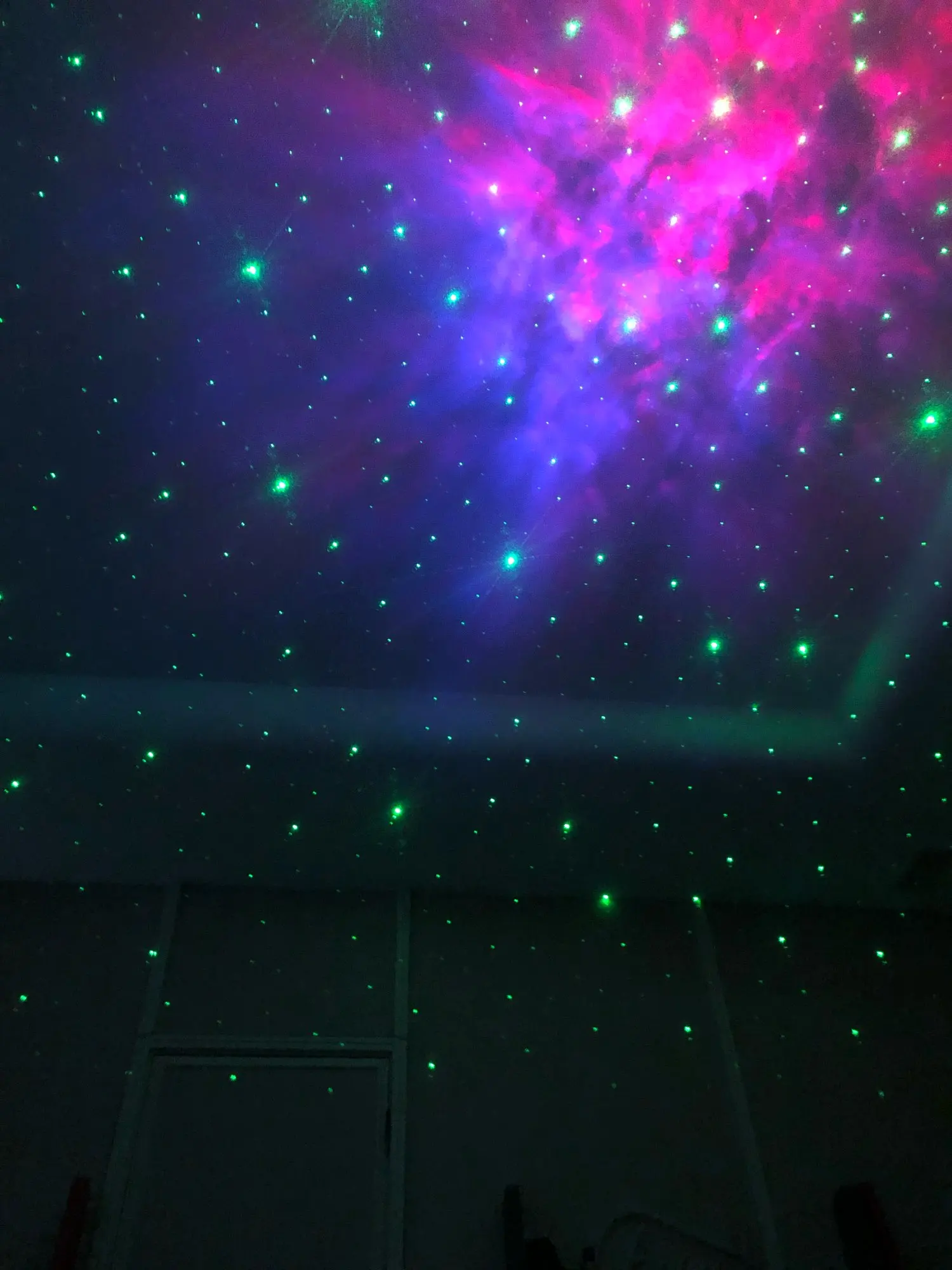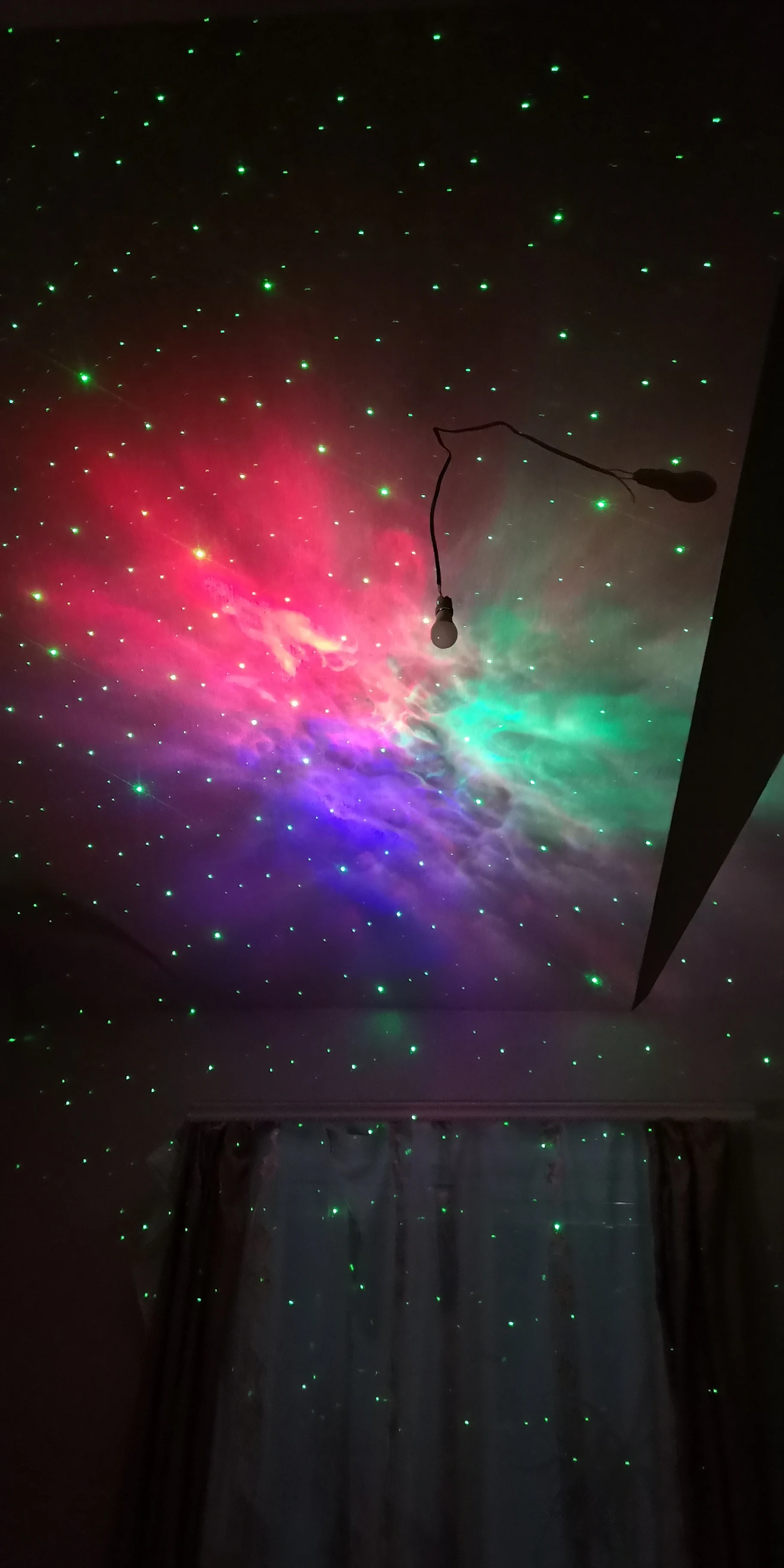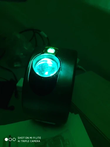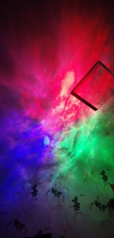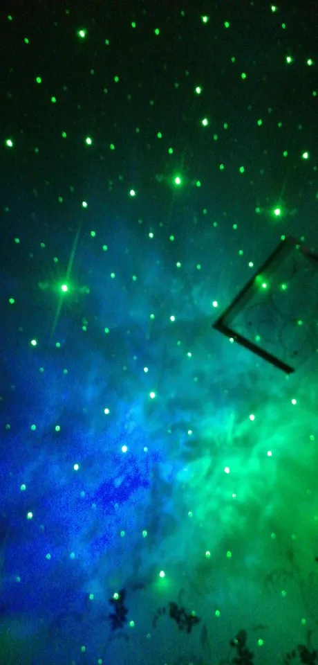 Он идеален, хоть и думала, что мне не зайдут зелёные звезды. Пришёл быстро, есть еле заметная царапина, но она явно не в пути была получена. Изменяется яркость - 3 режима: на минимуме насыщенная туманность и маленькие звезды (2 фото), максимальная яркость на 3 фото. Скоростей вращения 4: нулевая и от совсем медленной к динамичной. Режимы объектов: всё вместе, только звезды, только туманность. Туманность можно настроить 1 цвет, все комбинации двух цветов и 3 цвета, которые могут как проецироваться одновременно, так и перетекать из одного в другой. Батарейки к пульту не идут в комплекте, проектор работает от сети.