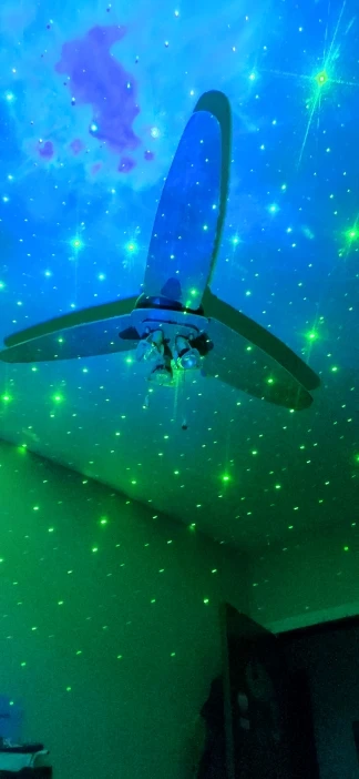 Невероятно!! Пульт дистанционного управления нуждается в двух маленьких батареях, вы можете изменить цвет облаков, переместить их или нет, сделать его быстрее или медленнее, но жаль, что зеленые звезды не меняют цвет