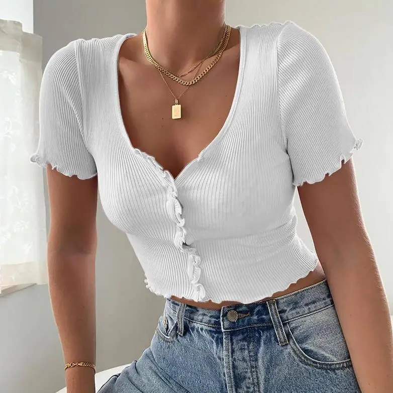 Топ женский летний на пуговицах, с коротким рукавом и V-образным вырезом, 12 видов, футболка с оборкой