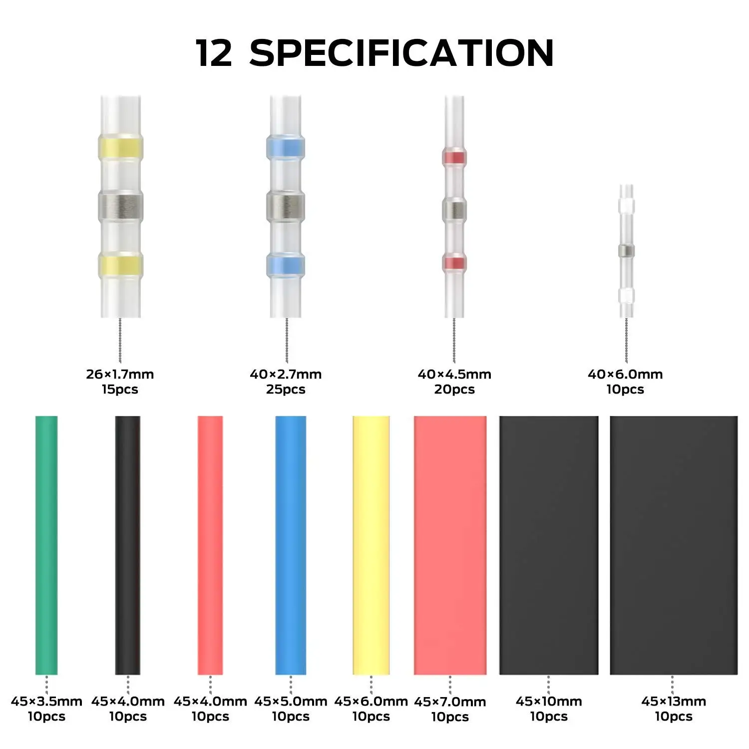 Характеристики продукта 2-в-1 термоусадка Стыковая набор, экономичный выбор-приходят с 240 шт. термоусадочные трубки и 120 шт. припоя уплотнения стыковые соединителиКонкретный цвет для ваших различных потребностей-поставляется с 5 цветами s 2:1 8 размерами термоусадочных труб и 4 цветами s для соединительных проводов для паяльного уплотненияВодонепроницаемый и изолированный-используется для ремонта автомобилей, морских и других низковольтных работ.Широкое использование: подходит для электрической изоляции, связывания проводов, цветового кодирования, механической защиты, соединения проводов/кабелей и ежедневного ремонта и т. д. Параметры: Для соединителей провода уплотнения припоя:Коэффициент усадки: 2:1Температура, которая начинает сокращаться: 80 ℃Температура, когда паяльное кольцо начинает плавиться: 111 ˚CТемпература, которая полностью расплава паяльного кольца: 138 ˚C Для термоусадочной трубки:Коэффициент усадки: 2:1Температура начала усадки: 70 ℃Полная Температура усадки: 125 ℃Рабочая температура: от-55 ℃ до + 125 ℃Предел прочности при растяжении: 10.4MpaДиэлектрическая прочность: 15 кВ/ммВоспламеняемость: невоспламеняющийся Посылка включает в себя: 70 шт. соединительные соединители для припоя:10 х Белый разъемы: Диаметр 1,7 мм, поперечное сечение 0,25-0,34 мм² (Б. В. Г.:26-24);20 x Красные Разъемы: Диаметр 2,7 мм кабеля, поперечное сечение 0,5-1,0 мм² (Б. В. Г.:22-18);25 x синий разъемы: Диаметр 4,5 мм кабеля, поперечное сечение 1,5-2,5 мм² (Б. В. Г.:16-14);15 x желтый разъемы: Диаметр 6,0 мм кабеля, поперечное сечение 4,0-6,0 мм² (Б. В. Г.:12-10). 80 шт термоусадочные трубки:10 шт. x 3.3,5 мм x 40 мм (длина) зеленый10 шт. x 4.4.0мм x 40 мм (длина) черный10 шт. x 4.4.0мм x 40 мм (длина) красный15 шт x 5.5.0мм x 40 мм (длина) синий15 шт. x 6.6.0 мм x 40 мм (длина) желтый10 шт. x 7.7.0 мм x 40 мм (длина) черный10 шт. x 10.10.0 мм x 40 мм (длина) черный10 шт. x 13.13.0 мм x 40 мм (длина) черный
