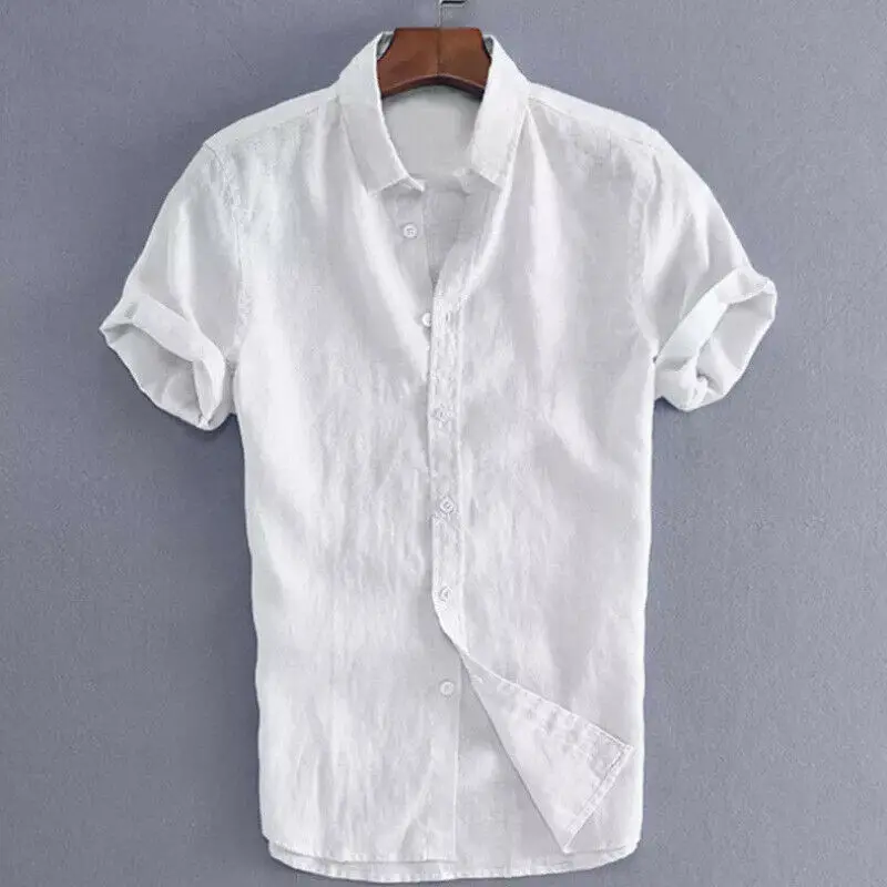 Мужские рубашки, из льна, с коротким рукавом, летняя, однотонная, повседневная, свободная, с отложным воротником, дышащая рубашка, Сорочки мужские