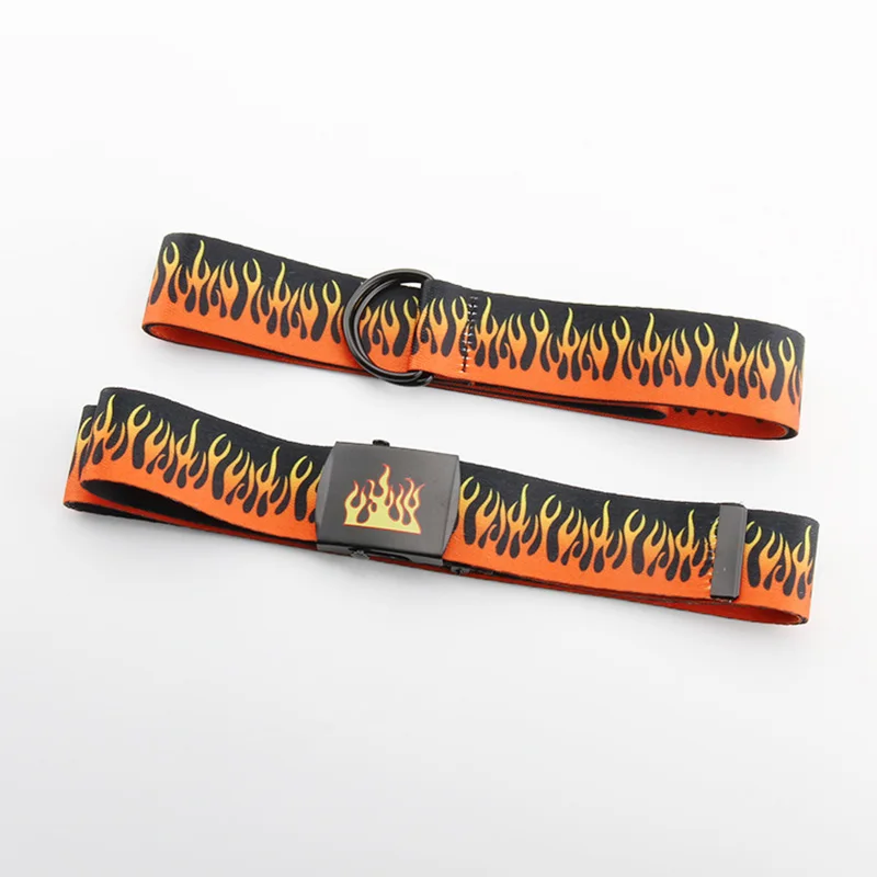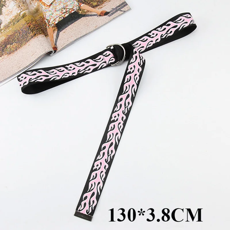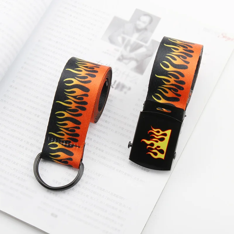 Ремень холщовый в стиле панкхип-хоп для мужчин и женщин, длинный пояс с принтом пламени и D-пряжкой, Модный молодежный пояс для джинсов и брюк в стиле Харадзюку