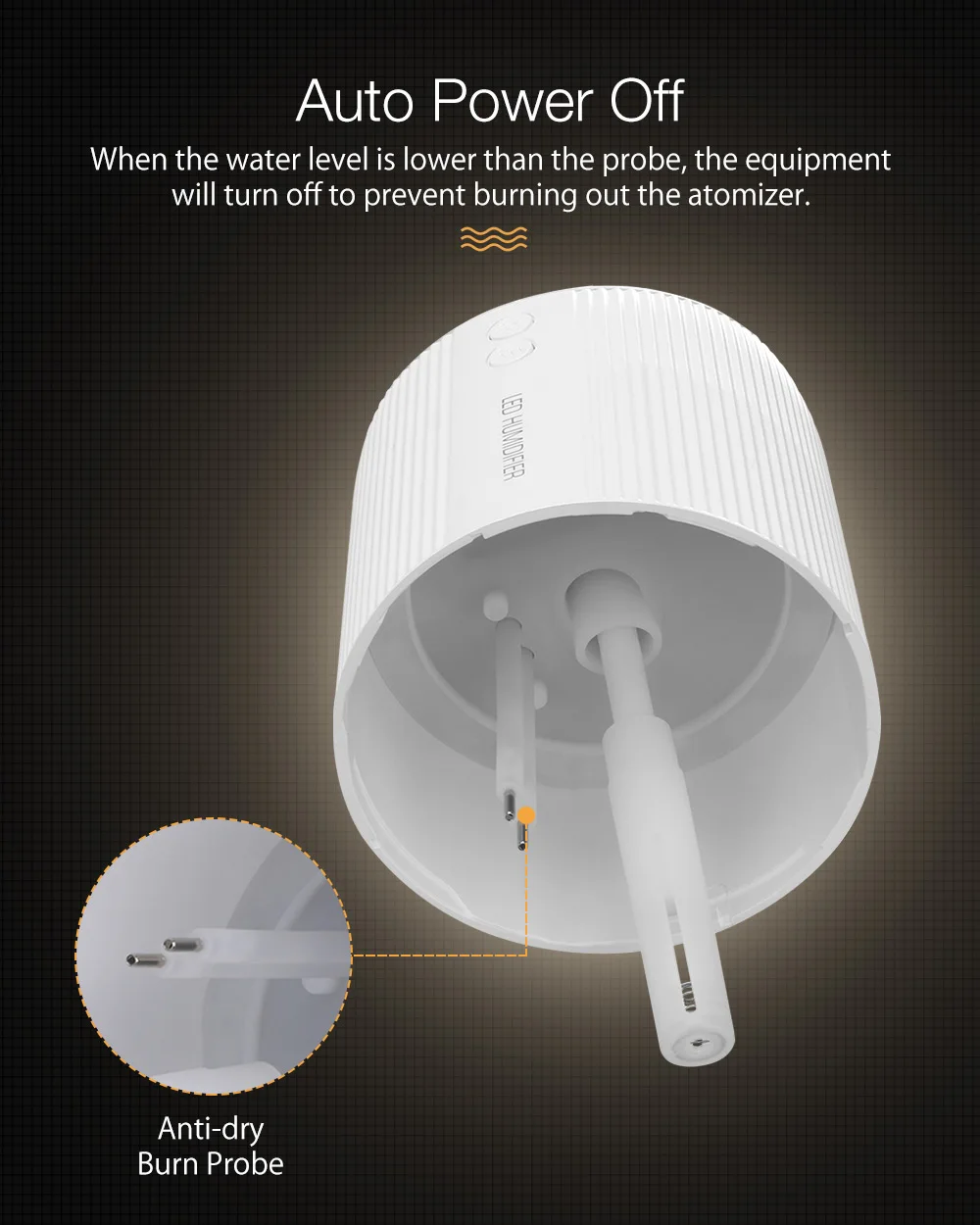 ① Когда зонд обнаруживает самую низкую воду, теплый светильник 3 раза мигает и останавливает распыление, и активируется защита от сухости.