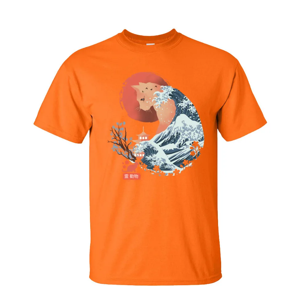 Мужская футболка из чистого хлопка с надписью Great Wave Spirit Animal Cat, персонализированные топы, модные вечерние футболки с круглым вырезом