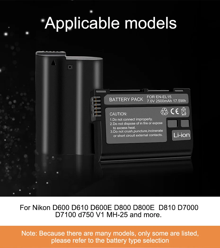 2500 мАч EN-EL15 цифровые аккумуляторы EN EL15 ENEL15 Аккумуляторы для камеры и двойное зарядное устройство USB для Nikon D600 D610 D600E D800 D800E D810 D7000 D7100 d750 V1 MH-25Совместимые модели:D600 D800 D800E D7000 D7100 V1 и т. д.Посылка входит:2 батареи EN-EL151 двойное зарядное устройство для ЖК-дисплеяОсобенности:1. Литий-ионные элементы премиум-класса, новый аккумулятор2. Высокая плотность энергии, сверхдлительный срок службы, без памяти3. Дополнительная мощность, больше снимков для ваших камер