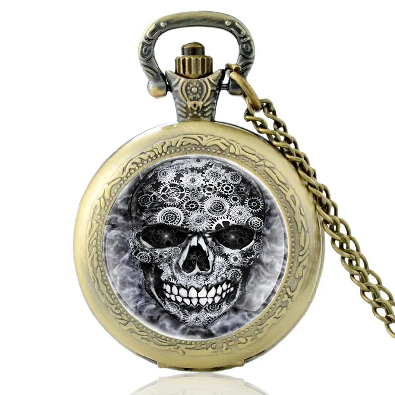 Часы наручные в стиле стимпанк, винтажные кварцевые карманные, со стеклянным куполом в виде черепа, с подвеской на ожерелье, подарок для мужчин и женщин