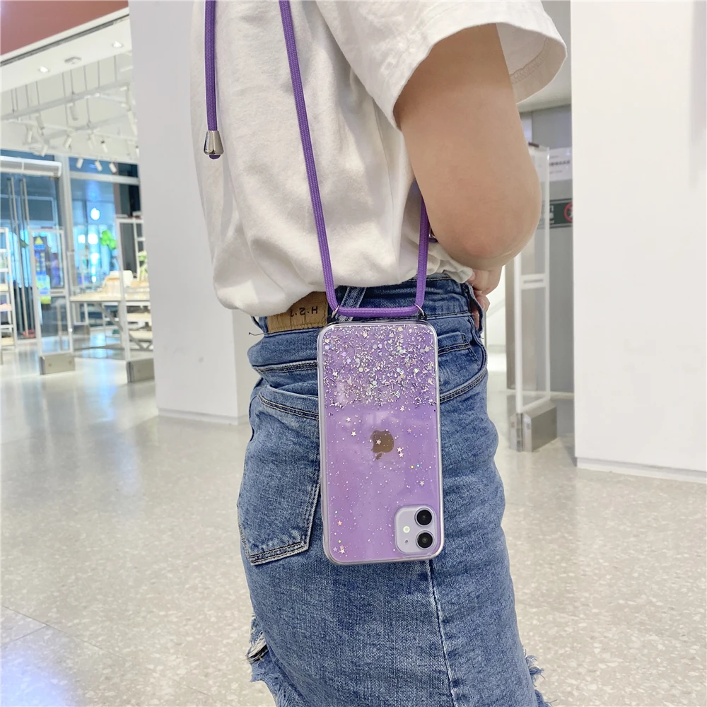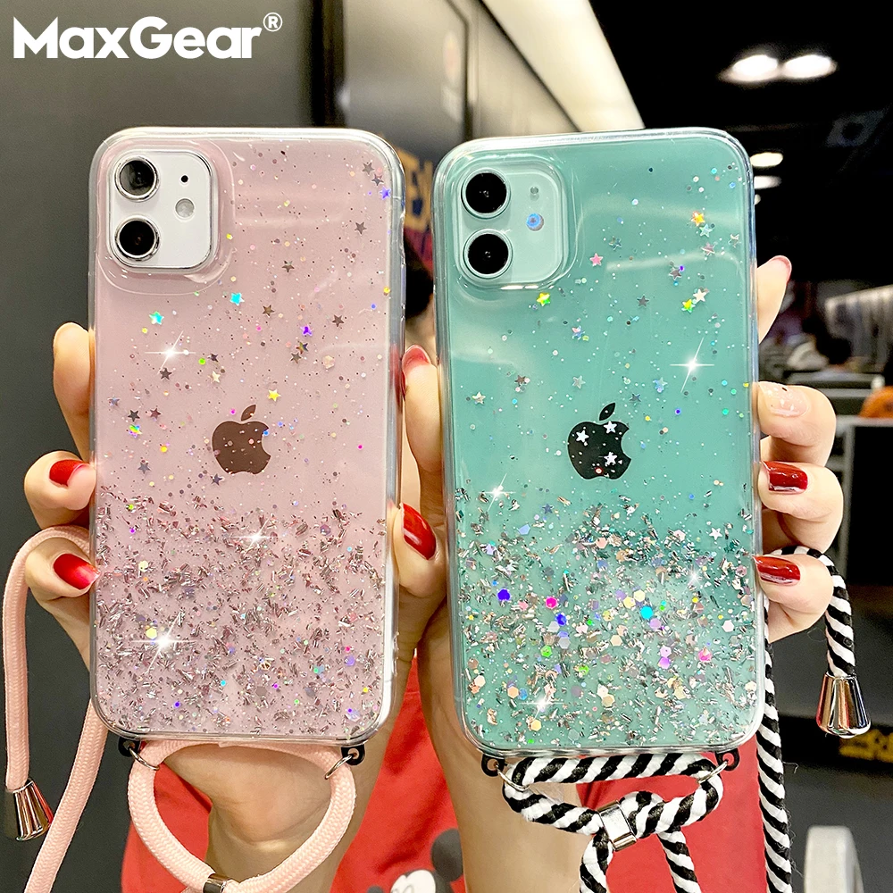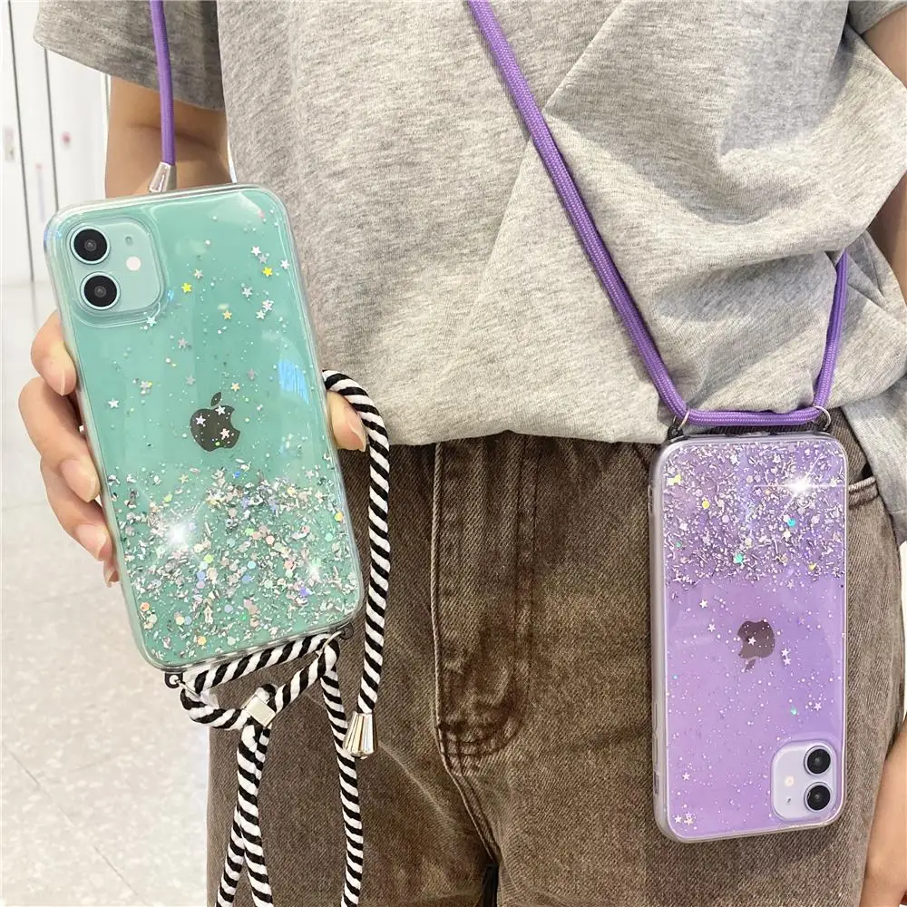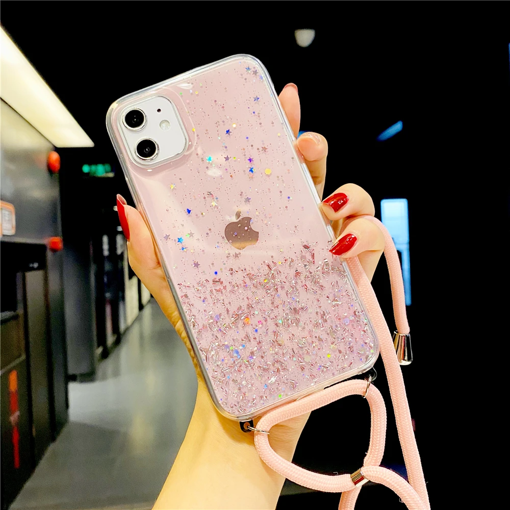 Блестящий Прозрачный мягкий чехол для iPhone 11 Pro X XS MAX XR 6 6S 7 8 Plus, чехол для телефона с подвеской и ремешком для iPhone SE 2020