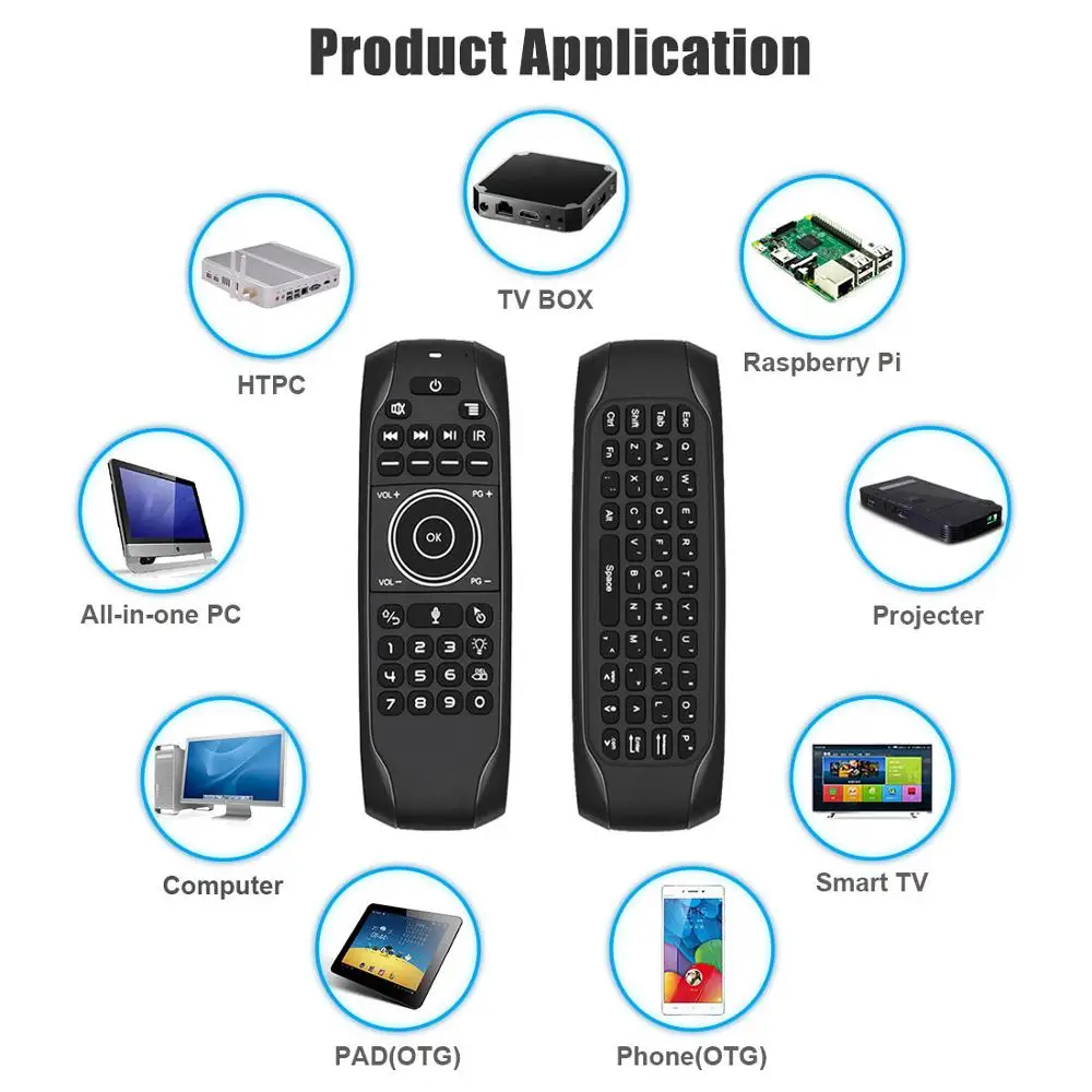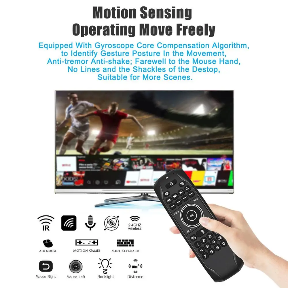 Особенности продукта:С подсветкой;Голосовой ввод;5 ИК-кнопок обучения;Приятные ощущения, Классический изогнутый дизайн с кнопками на обеих сторонах пульта;Низкая мощность беспроводного подключения 2.4g, сильная способность анти-помехи, состояние подключения Светодиодный индикатор;Работа при пониженном напряжении: 3,6-4,2 в;Интеллектуальная стабилизация для плавного скольжения курсора по экрану.Характеристики продуктаМетод передачи: 2,4G RF беспроводнойСенсор s: 3 оси гироскопа + 3 оси гравитационного СенсорКоличество клавиш: 77Диапазон: >10mBatteryТип: Встроенный литиевый аккумуляторМатериал: пластик и силиконРазмер: 168*55*16 ммВес: 100 г