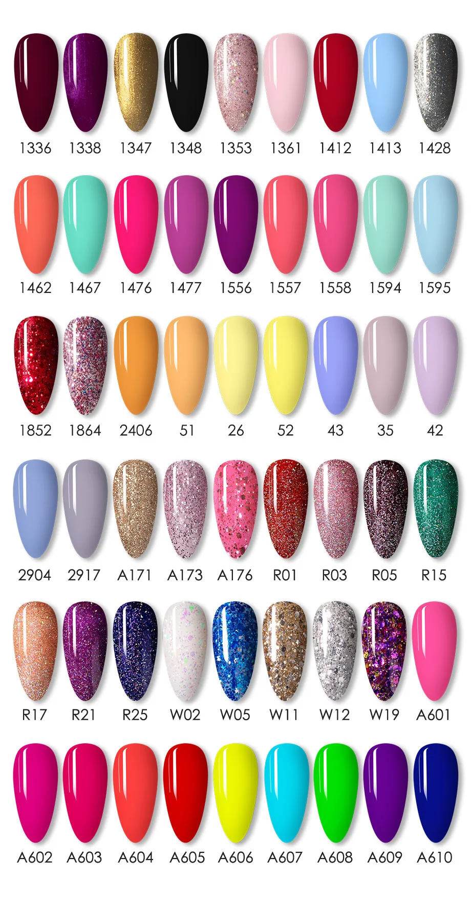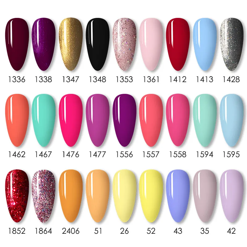 Отличные гель лаки, как на фото цвета, бутыльки по 7 мл, полностью заполненные, запаха у лаков нет, с блёстками вообще красивые, цвета плотные, ложатся отлично, паутинки тоже понравились,быстрая доставка курьером до двери