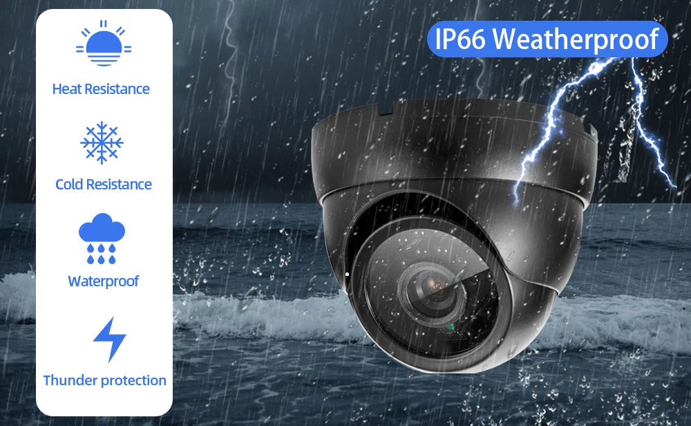 Используйте их в качестве наружных камер или крытых камер, так как они построены жестко, выдерживает любую погоду: дождь, снег, пыль и жаркие дни. С защитой от атмосферных воздействий IP66 и кабелями, просвечивающимися через подставку для защиты, гарантируем, что вы сможете ответить на их производительность, день в день. Наша камера имеет сверхпрочный металлический корпус, профессиональный IP66, устойчивый к атмосферным воздействиям, обеспечивая стабильную производительность как внутри, так и снаружи.