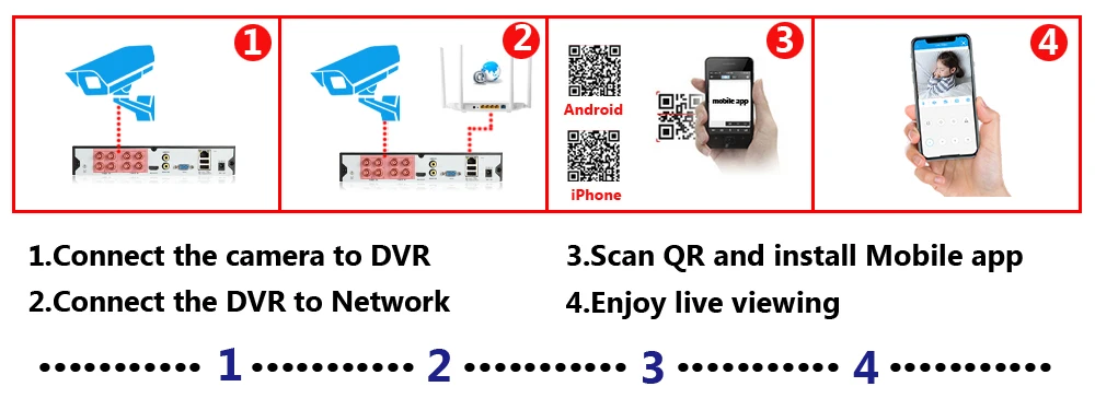 Простая настройка, всего 4 шага для просмотра мобильный телефон, просмотра видео в режиме реального времени из любого места и в любое время с помощью смартфона, стола или ПК с передовой технологией P2P, вы можете получить удаленный доступ к вашей системе за считанные минуты или меньше, нет необходимости в переадресации, удаленный доступ никогда не был таким простым!